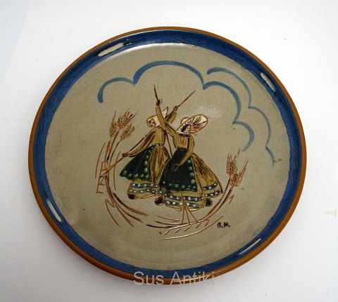 Text available in Danish: Knabstrup, Danmarkstellet produceret ca 1945-1953, gildestel designet af Aksel Sigvald Nielsen, der var kunstnerisk leder på malerstuen på Knabstrup. Stort fad med kvindelige høstarbejdere. Diameter 31 cm. Højde ca 2,5 cm. Fin stand. Pris: 550 kr.