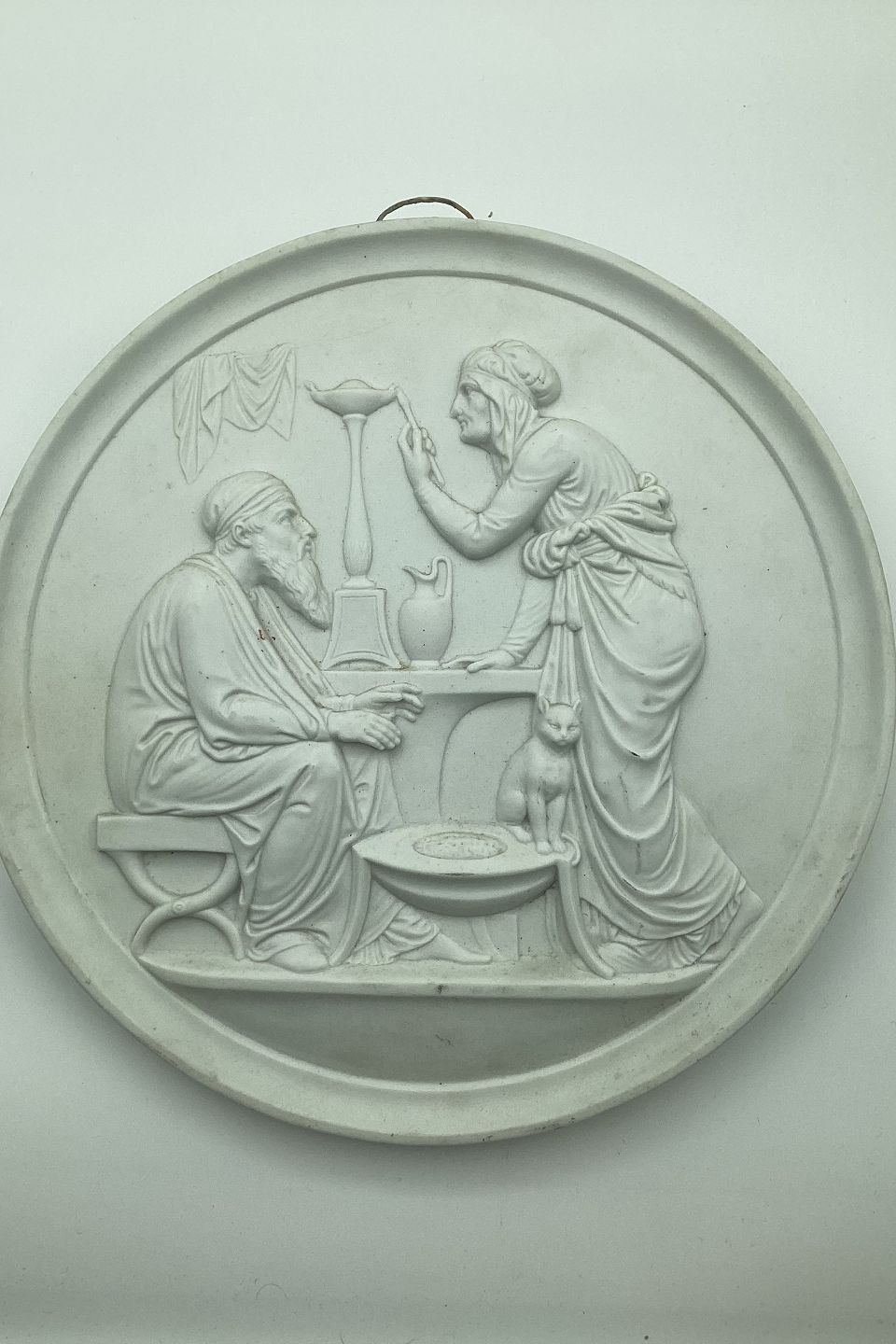 Bertel Thorvaldsen: Bing and Grondahl bisquit plate "Old age and winter" After relief modeled in Rome 1836. Measures 29cm (11.41 inches). Made in the late 19th century.