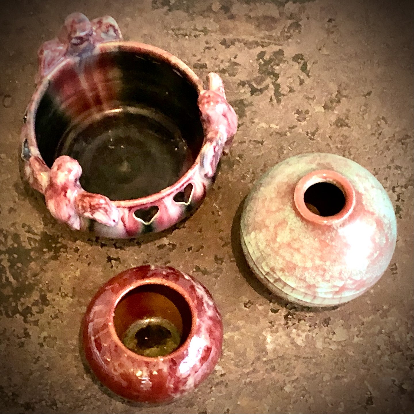 3 dele keamik. Michael Andersen skål med tre fugle. Rødsort løbeglasur .H. 11 cm Ø 14 cm. Pris 1200kr. Lille Michael Anderes vase H. 10 cm. Ø 9,5 cm pris 700 kr. Lille vase