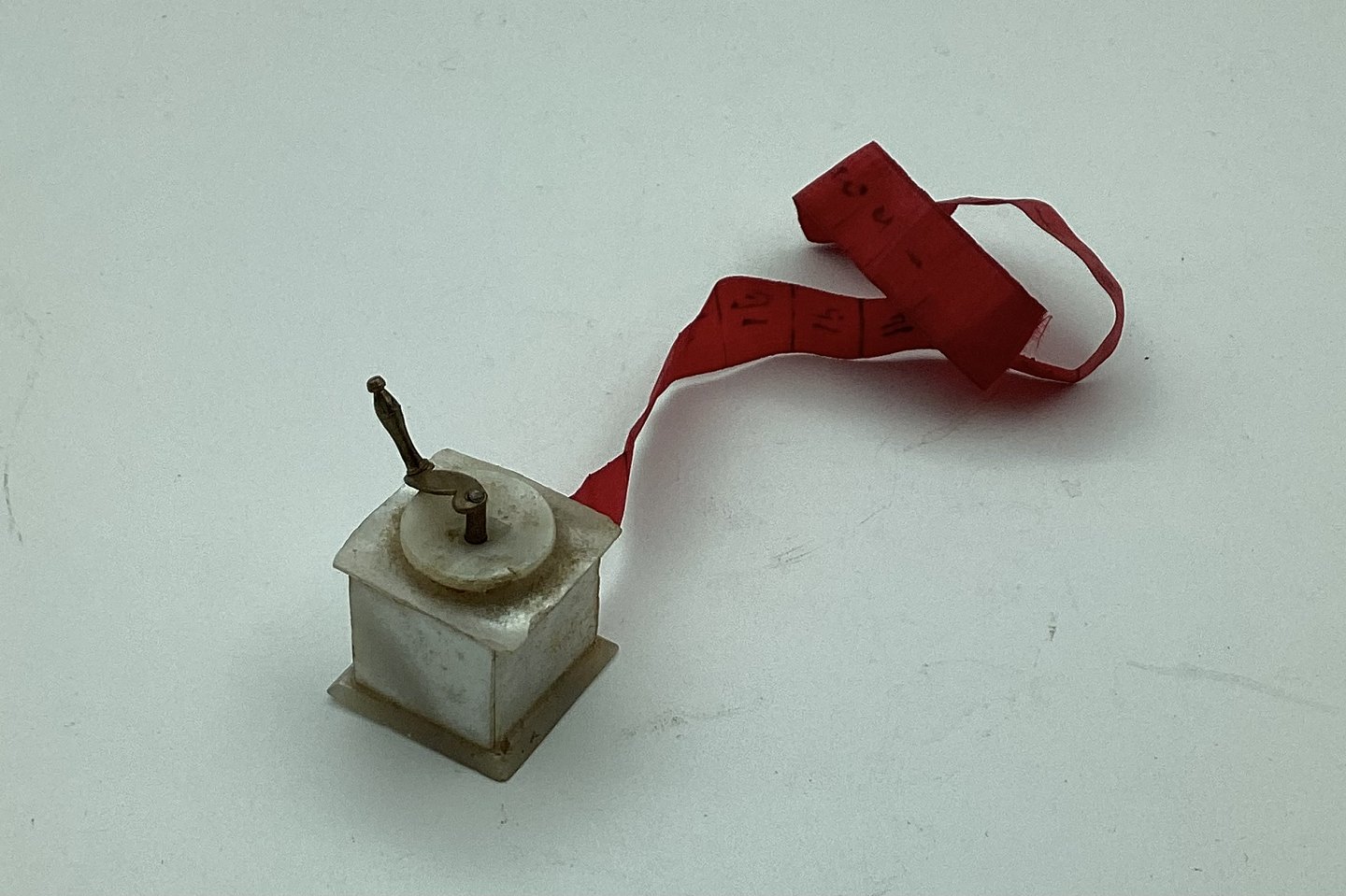 Measuring tape with mother-of-pearl box c. 1880. Does not work. The measuring tape cannot be rolled up. The box measures 2 x 2 cm (0.78 x 0.78 inch)