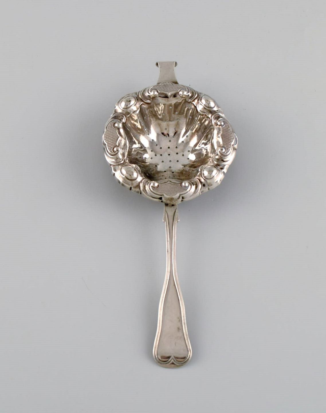 European silversmith. Antique silver tea strainer. Dated 1855