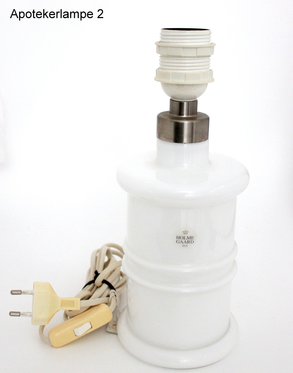Holmegaard, Apoteker serien, Mini hvid opaline lampe. Designet af Sidse Werner 1985. Højde incl. fatning ca. 26 cm. Diameter 11 cm. Fin stand dog med lettere misfarvet gullig afbryder på dem begge. (Modelfoto). Pris: 550 kr. stk. Lager: 2