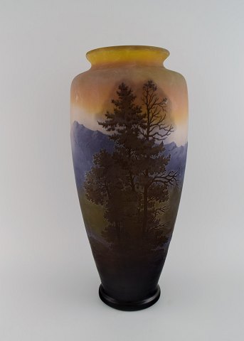 Émile Gallé (1846-1904), France. Very large and rare "Vosges" vase in mouth blown cameo art glass. Mountain landscape with trees in relief. Approx. 1900.