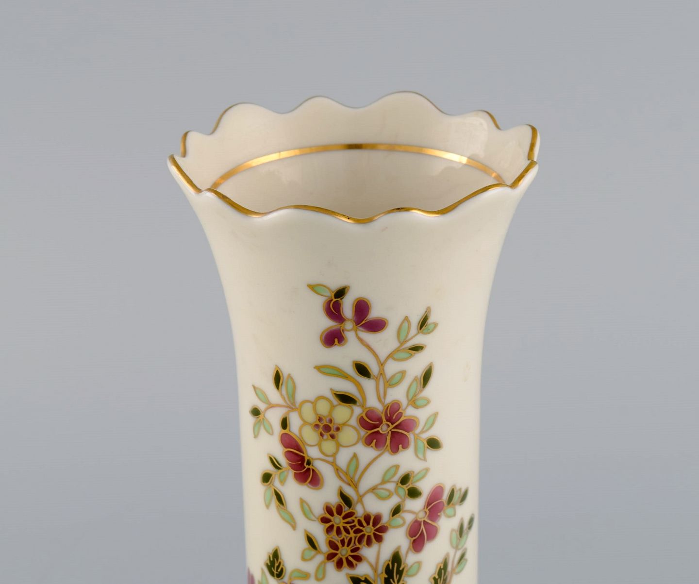Zsolnay vase i cremefarvet porcelæn med håndmalede blomster og gulddekoration. Sent 1900-tallet.