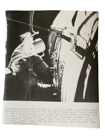 Original Black and White press photo by NASA (distributed by Associated Press – AP by wire) from the Apollo 17 mission in December 1972 of command module pilot Ronald E. Evans.