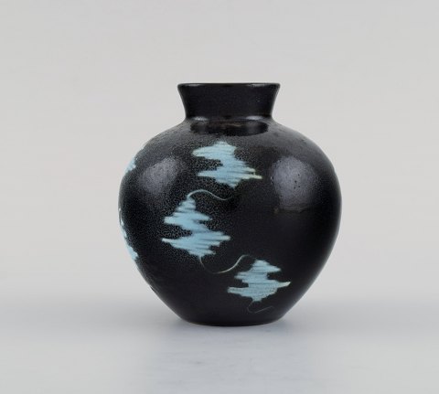 Europæisk studiokeramiker. Unika vase i glaseret stentøj. Lyseblå strejf på sort baggrund. 1960/70'erne.
