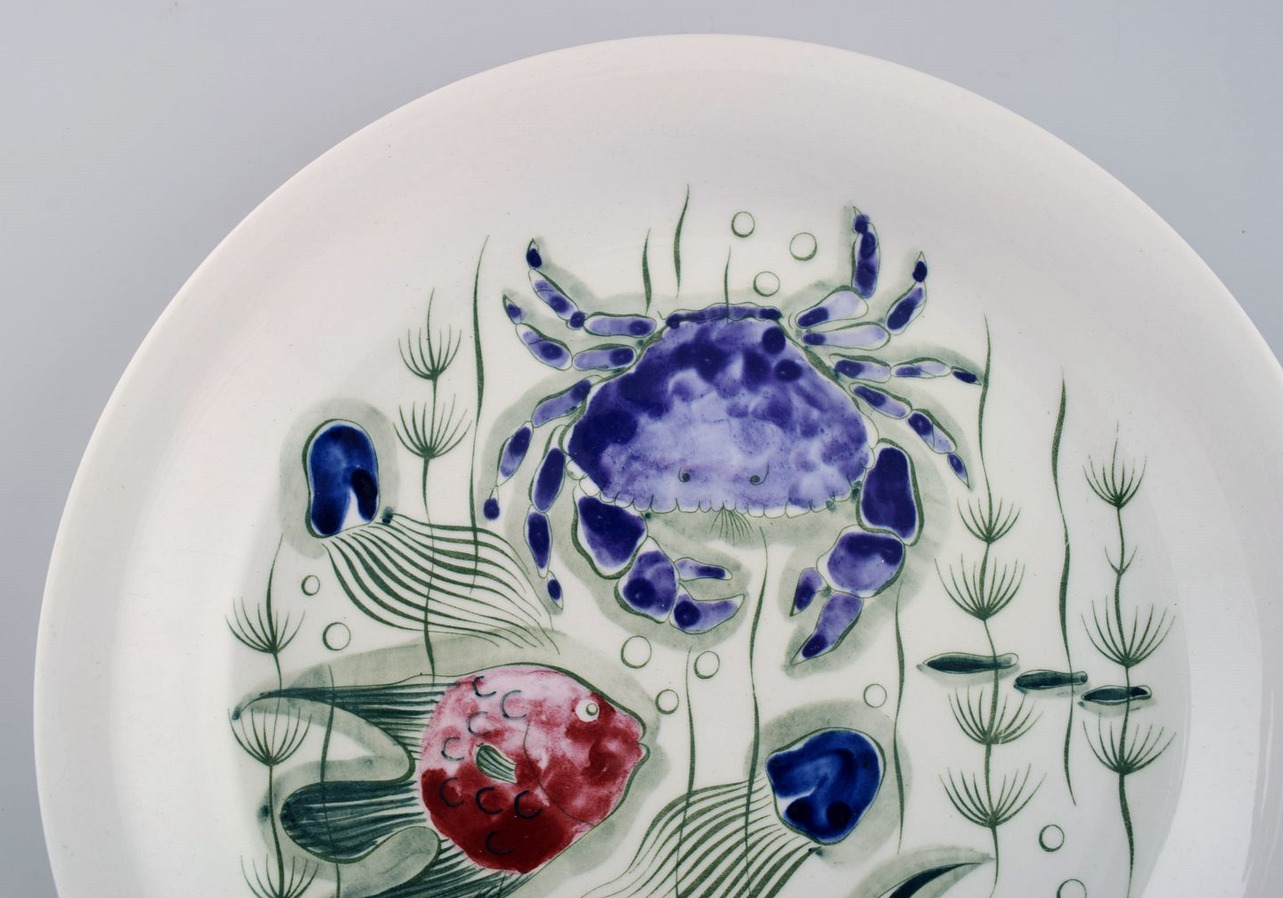 Anja Juurikkala for Arabia. Four "Crayfish" dinner plates in hand-painted stoneware. Underwater scene with fish and crabs. Mid 20th century.