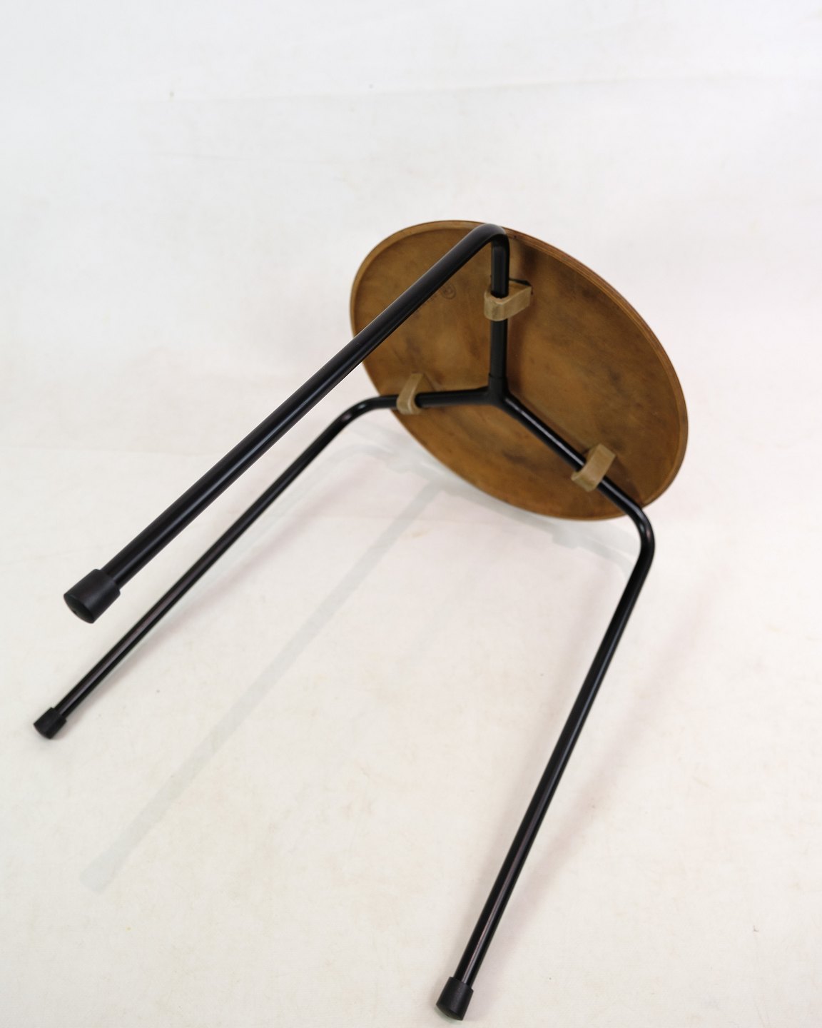 A set of teak stools with a black frame, designed by Arne Jacobsen and manufactured by Fritz Hansen from around the 1950s.