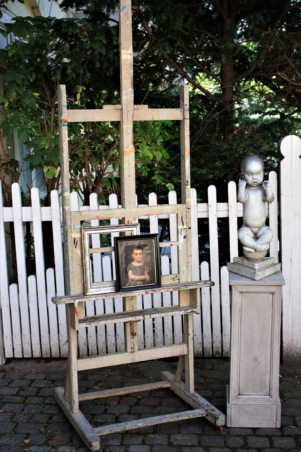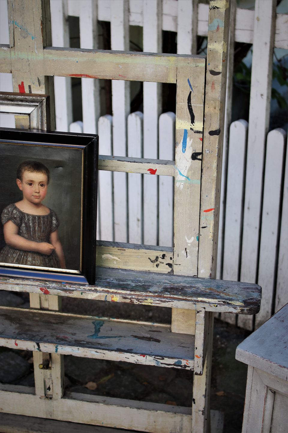 Decorative old painting easel in wooden gray color and with a super fine patina. Can be used to "exhibit" art on , a mirror or flat screen TV. The easel can be adjusted in height.
