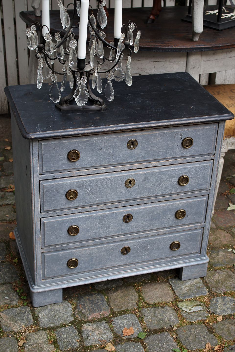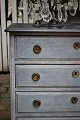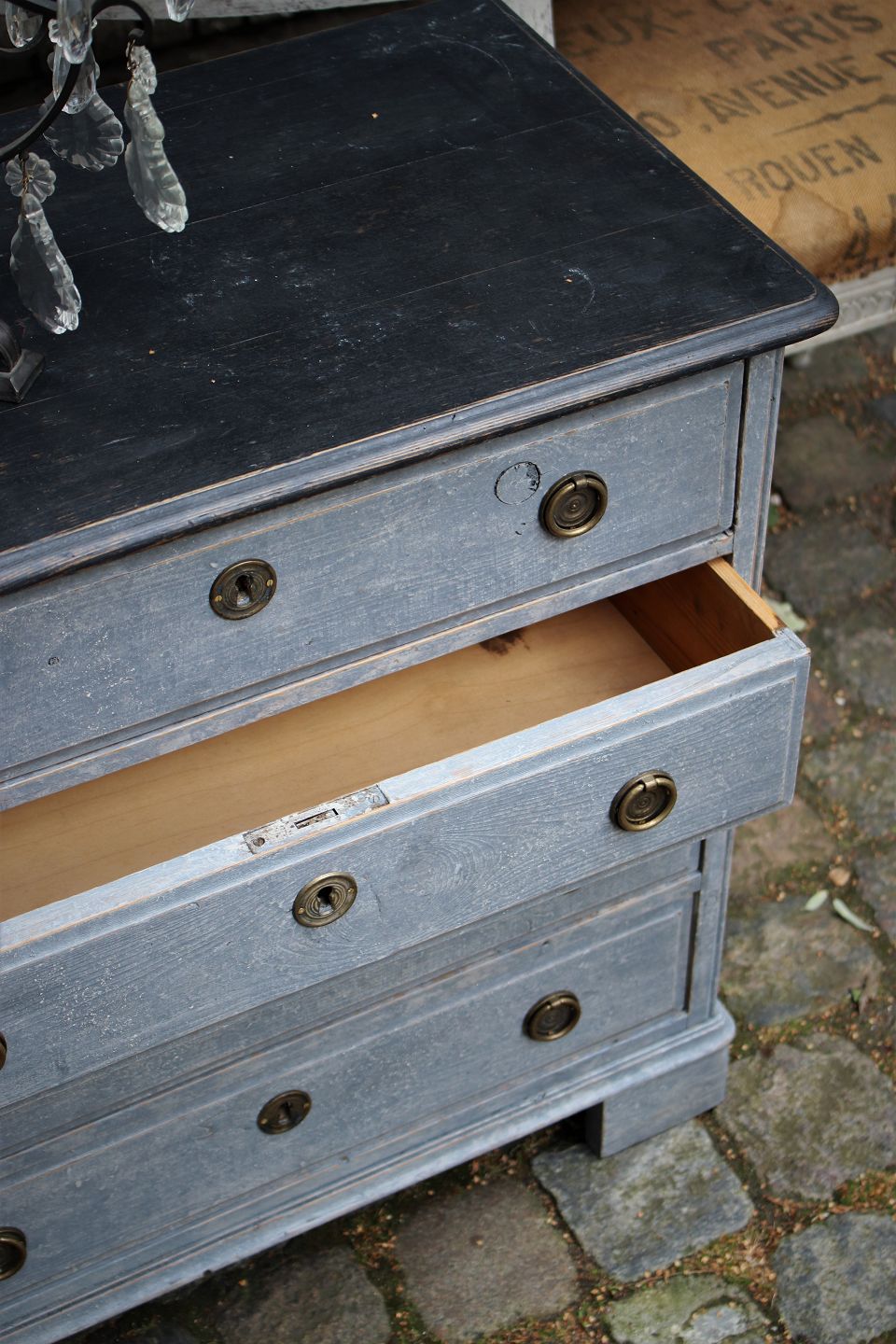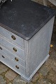 Fine, small old chest of drawers in fine patinated gray painted wood with black painted marbled top.