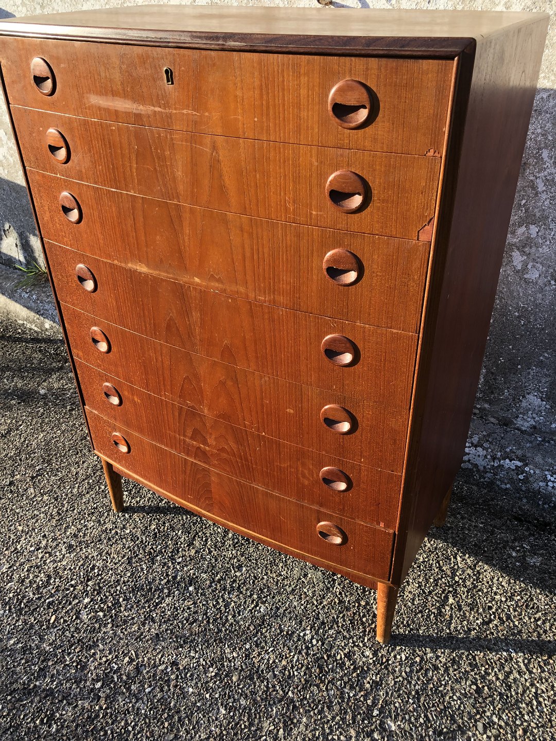 Chest of drawers in teak veneer from the 1960s with curved front. Appears to have fine handles but with some veneer chips / scratches. (see photo) Danish modern. 113x80x44 cm