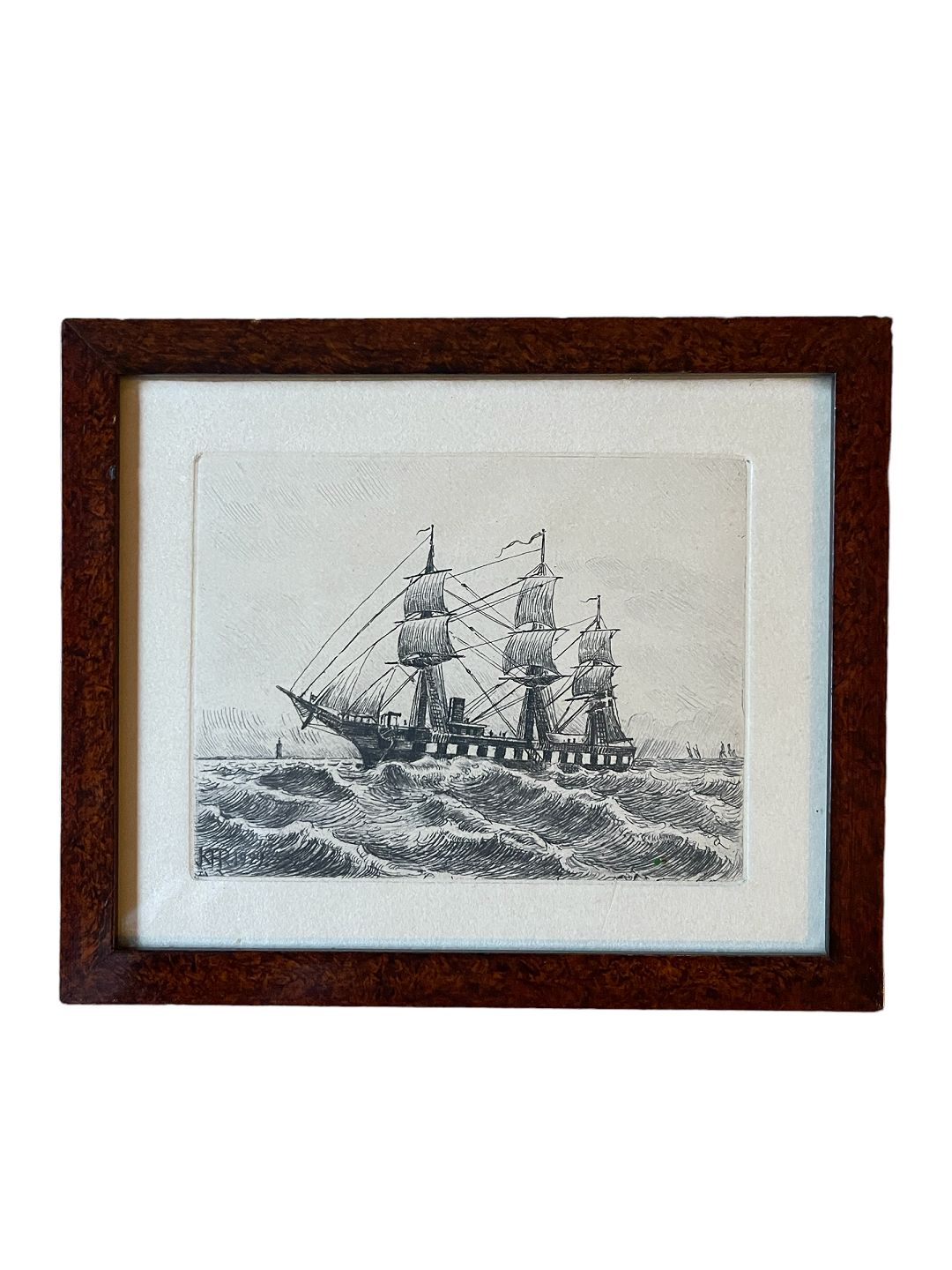Original etching by Karl Hansen Reistrup (1863-1929), of navy vessel. Signed with the artist's monogram signature and 1929 in the print. One of his last works.