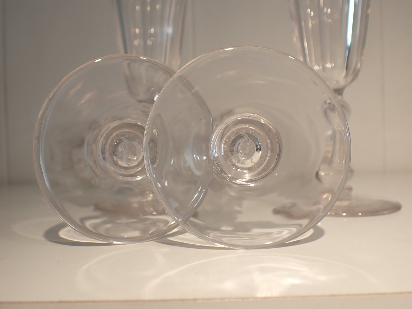 Text available in Danish: 4 champagnefløjter belgisk type formentlig fra Holmegaard - krystal glas, kumme med store facetslibninger, omvendt ballusterstilk med luftlomme på flad rund fod. Ca. 1900. Højde 16,4 - 16,6 cm. I fin stand. Sælges kun samlet.
