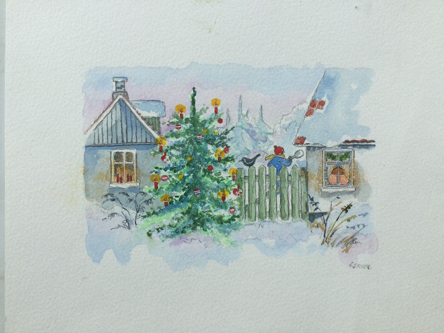 Akvarel af Erik Stuhr - Der skovles sne i jule eksteriør.
