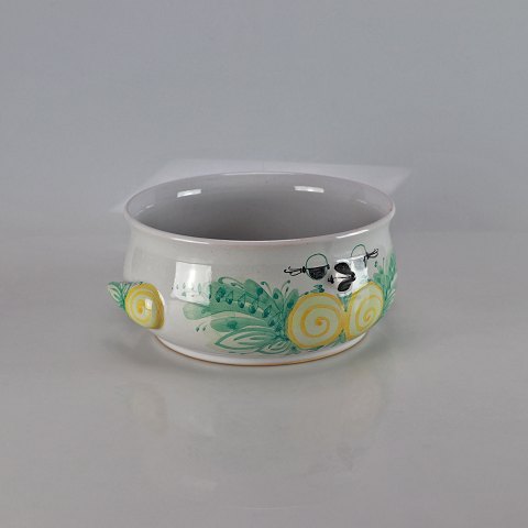 Farverig skål af Bjørn Wiinblad malet som fugl i grønne og gul farver.