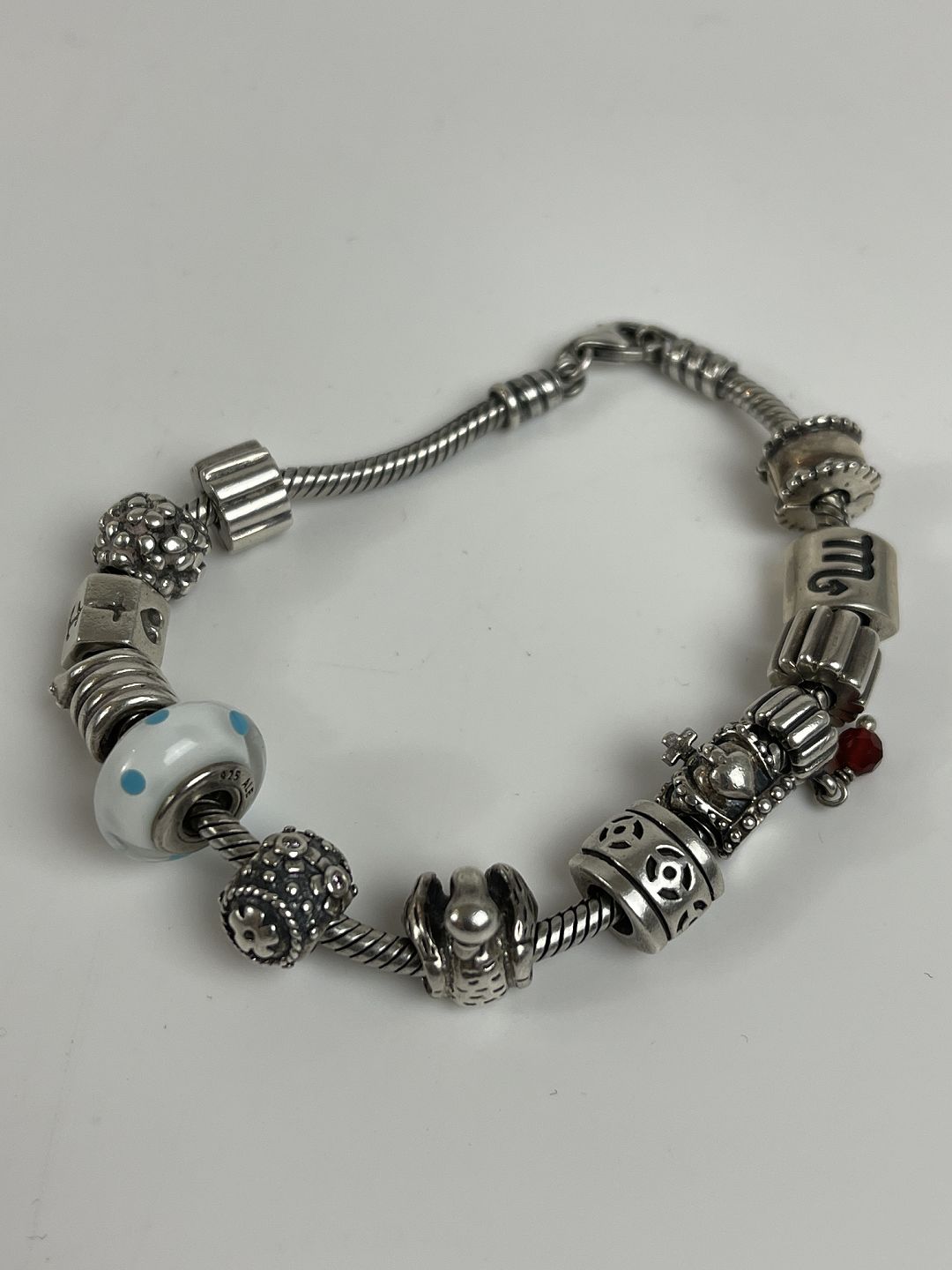 Vintage Pandora armbånd med charms og mellemled, 925 sterlingsølv.