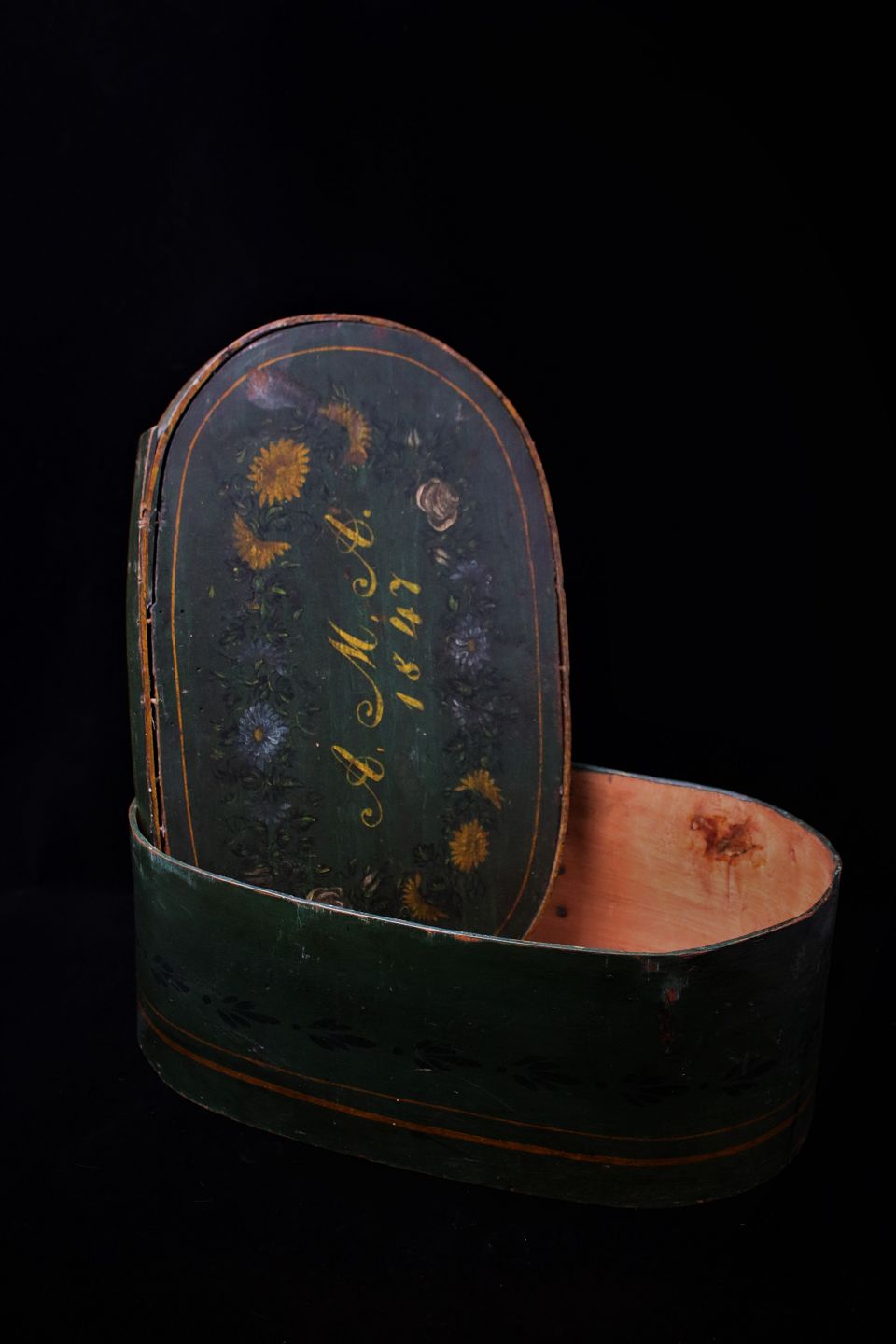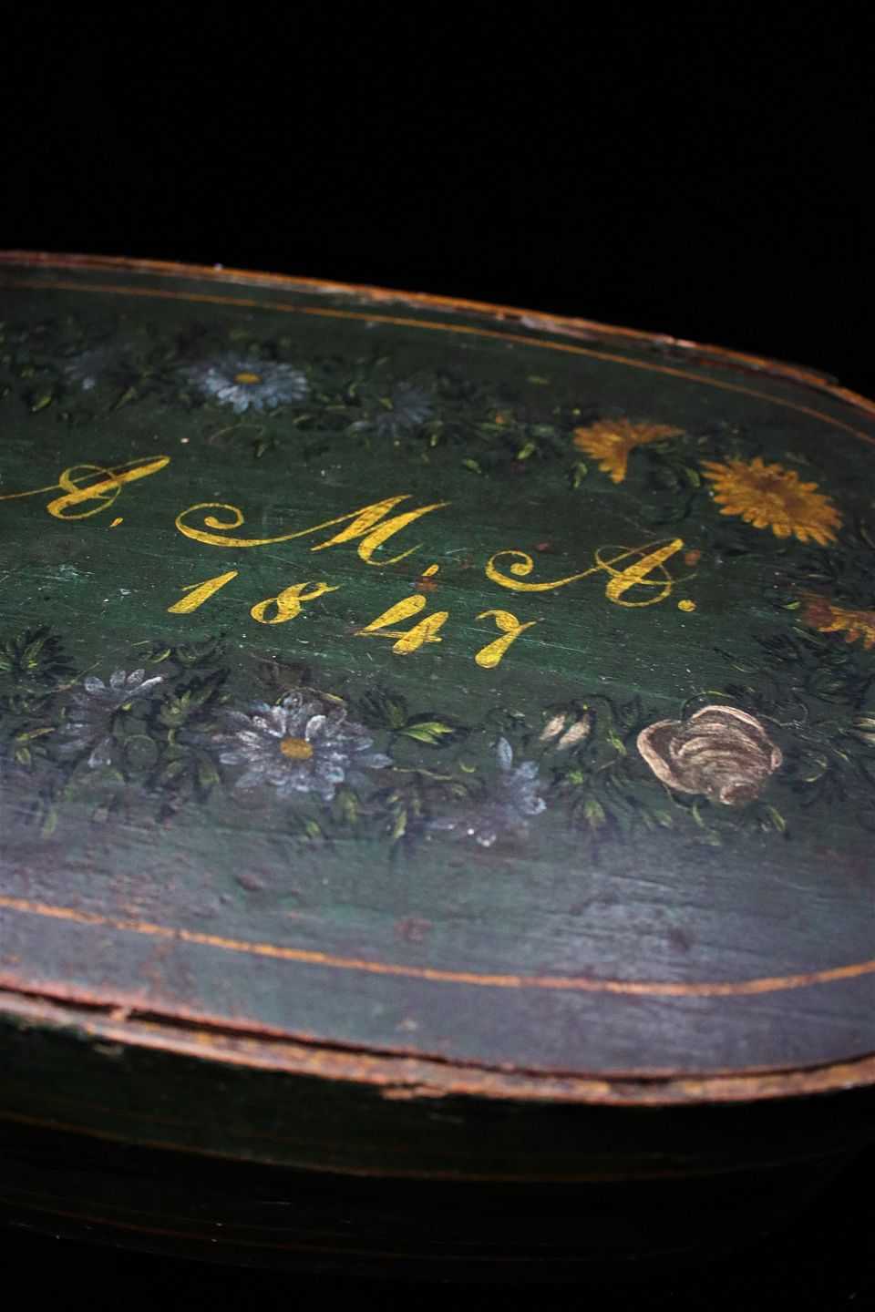 Antique Swedish 19th century oval wooden box with lid and fine original green painting with various floral motifs, dated 1847.