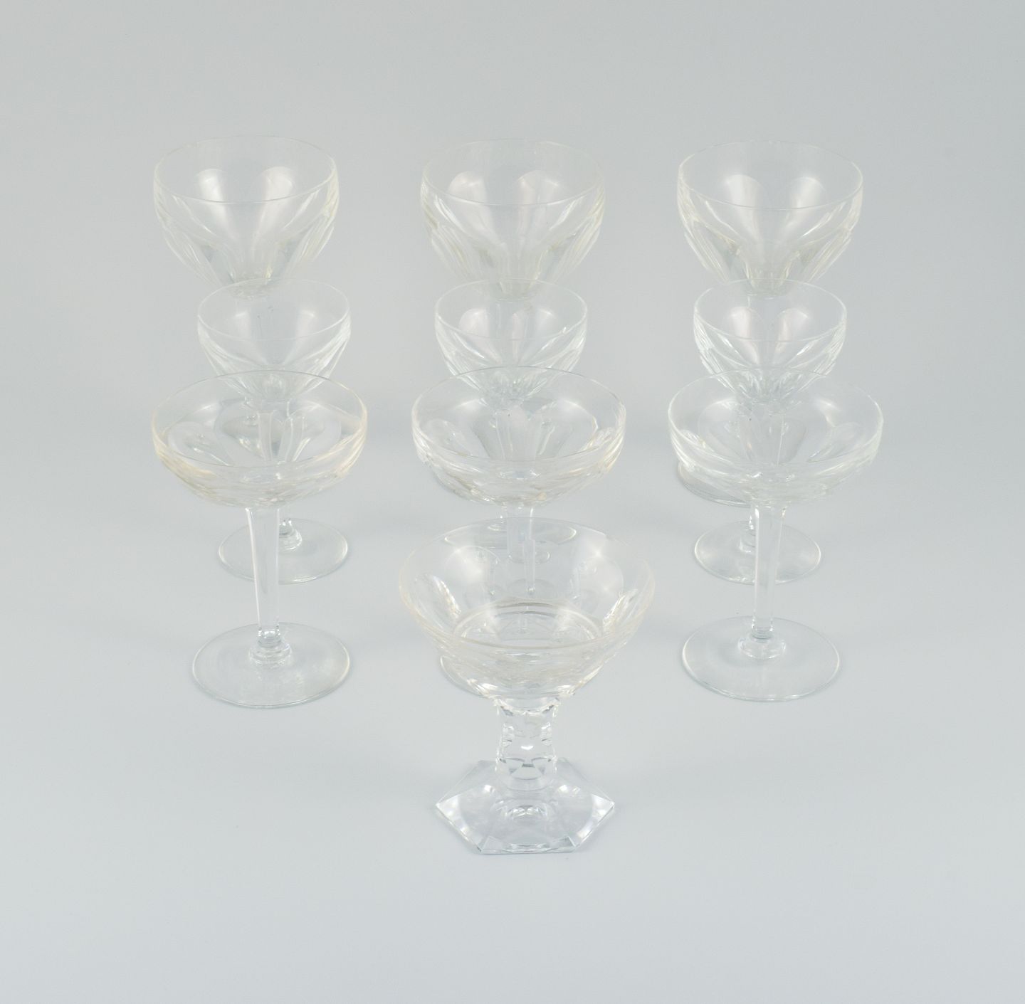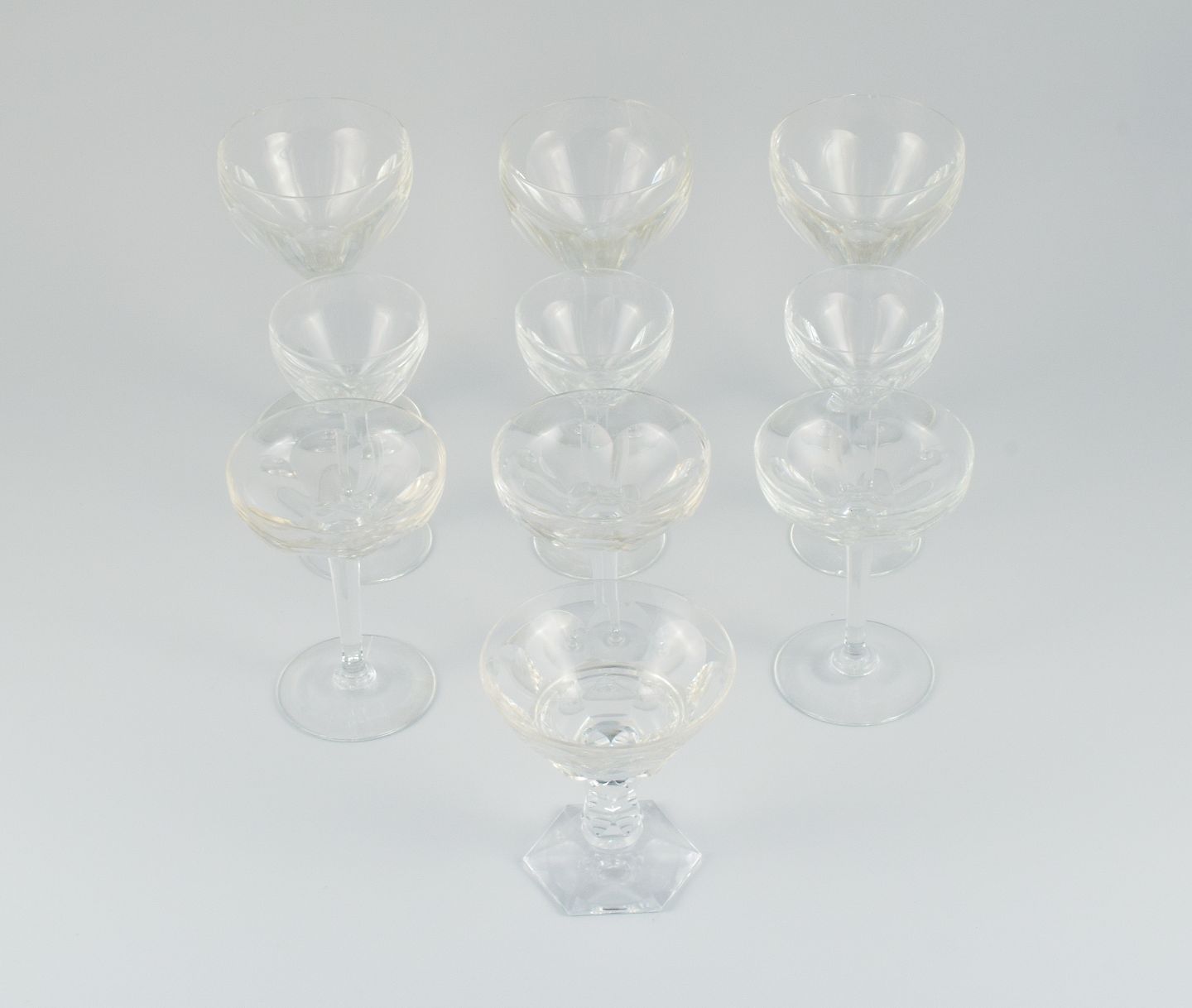Baccarat, France, ten Art Deco crystal glasses in clear glass, consisting of 3 red wine glasses, 4 Champagne glasses and 3 white wine glasses.