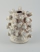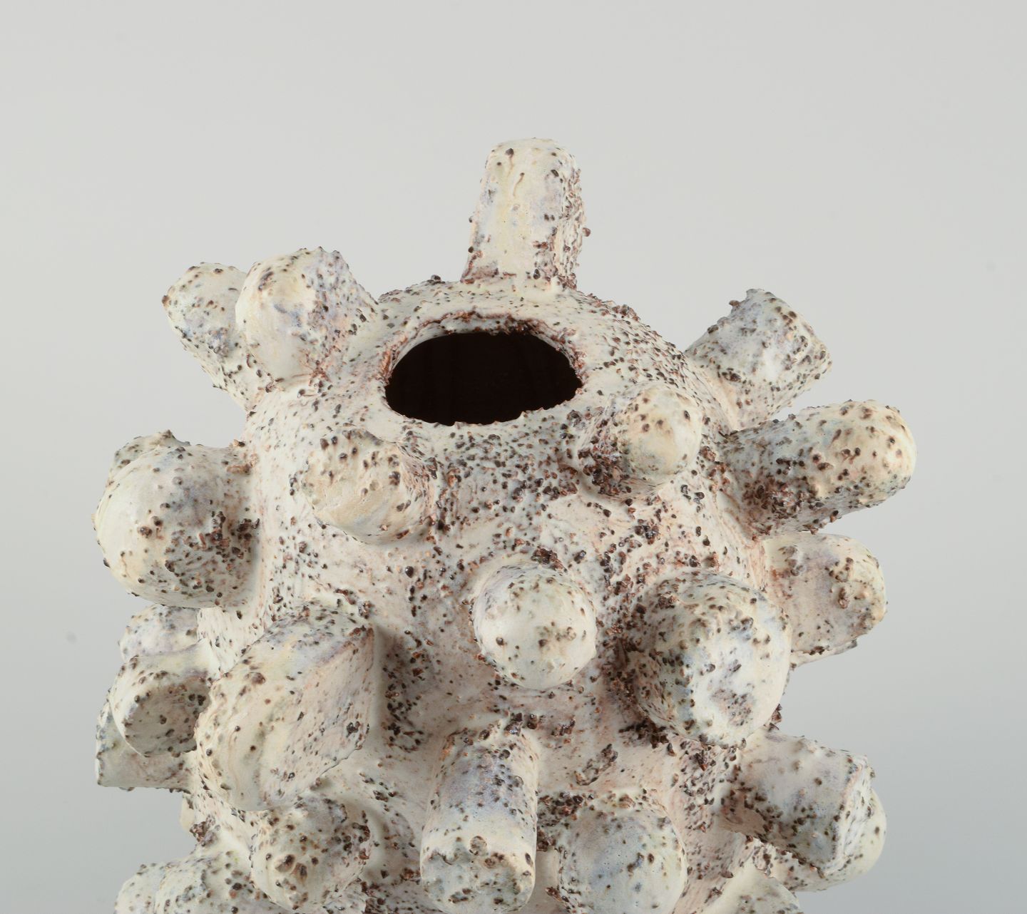 Large unique stoneware sculpture in offwhite glaze with ironcovered specks.