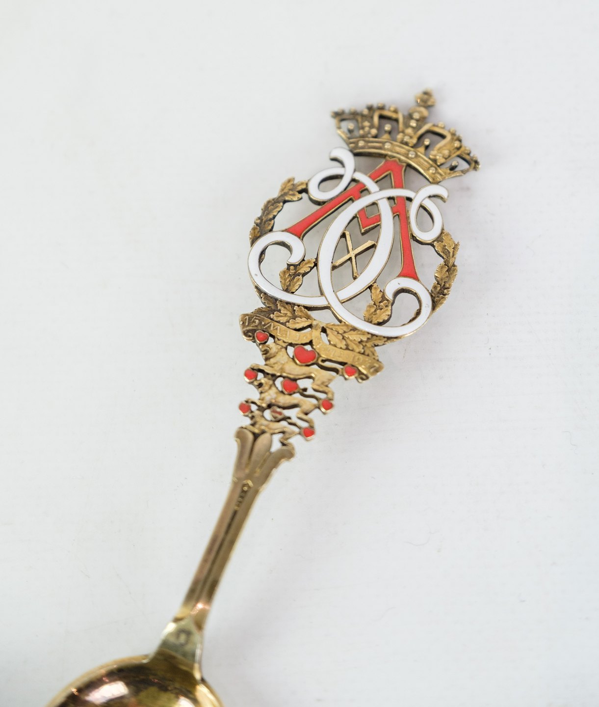 Jubilee spoon by A. Michelsen in gilded sterling silver decorated with white and red enamel on the occasion of King Christian X's 25th anniversary of the reign of 15 May 1912 - 1937. Which is engraved on the spoon.