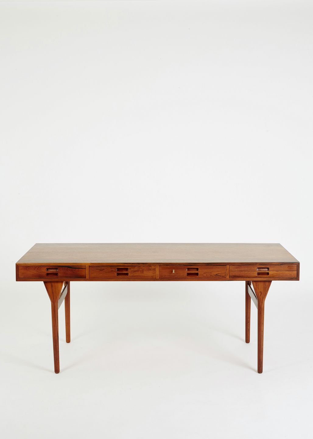 Nanna Ditzel.Free-standing cassette-shaped desk in rosewood, frame with four integrated drawers, on round cone-shaped legs. Designed in 1958. Manufactured at Søren Willadsen, Vejen.