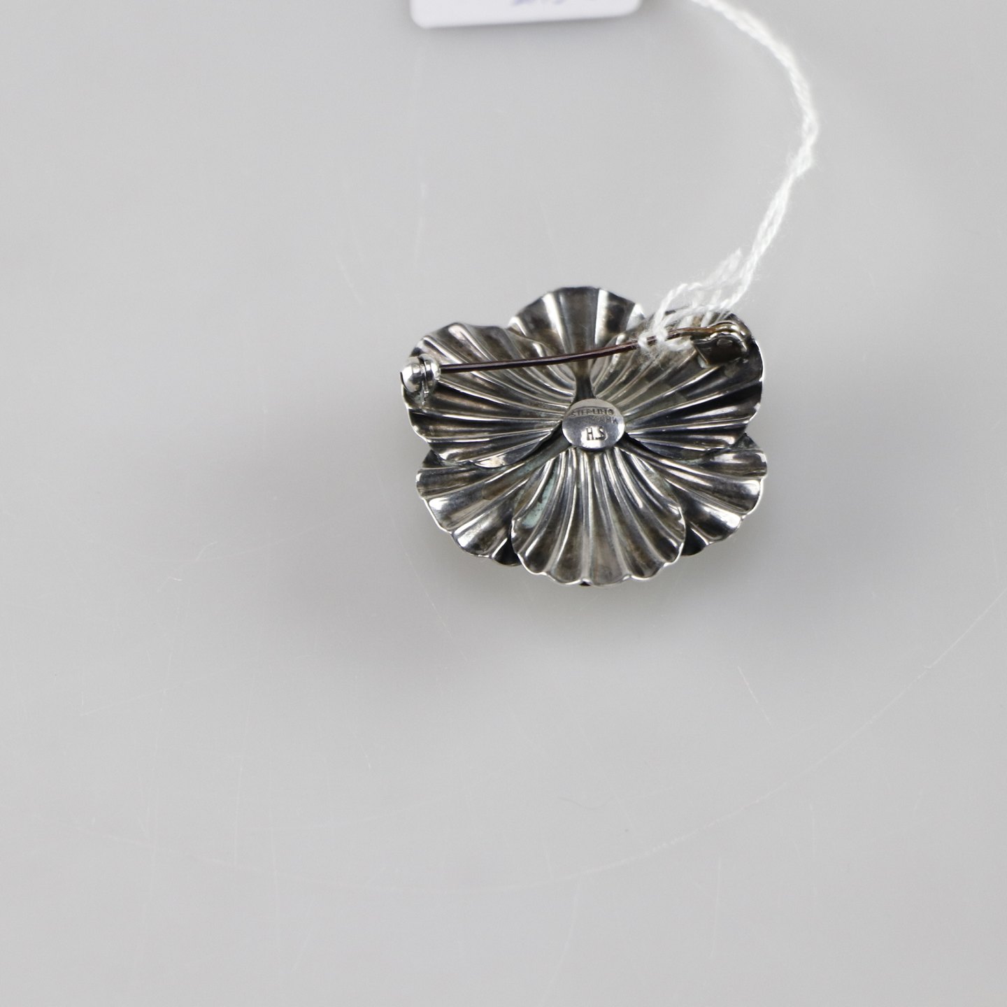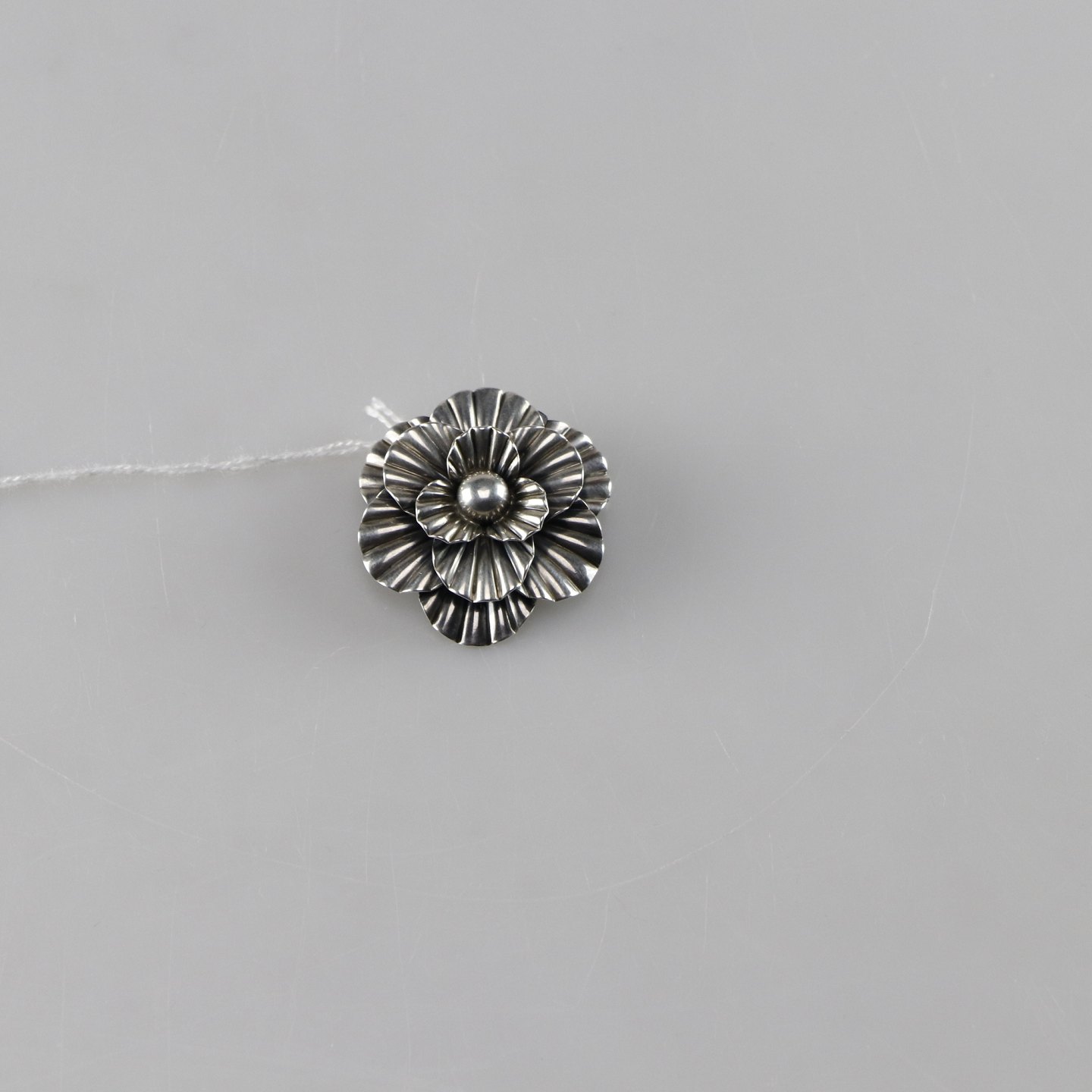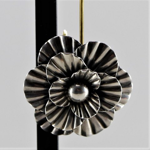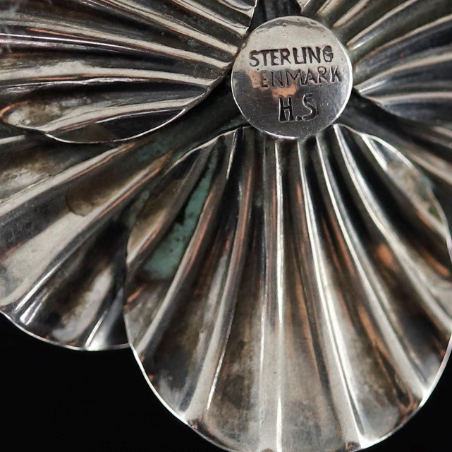 Rund broche i sterling sølv med blomstermotiv
