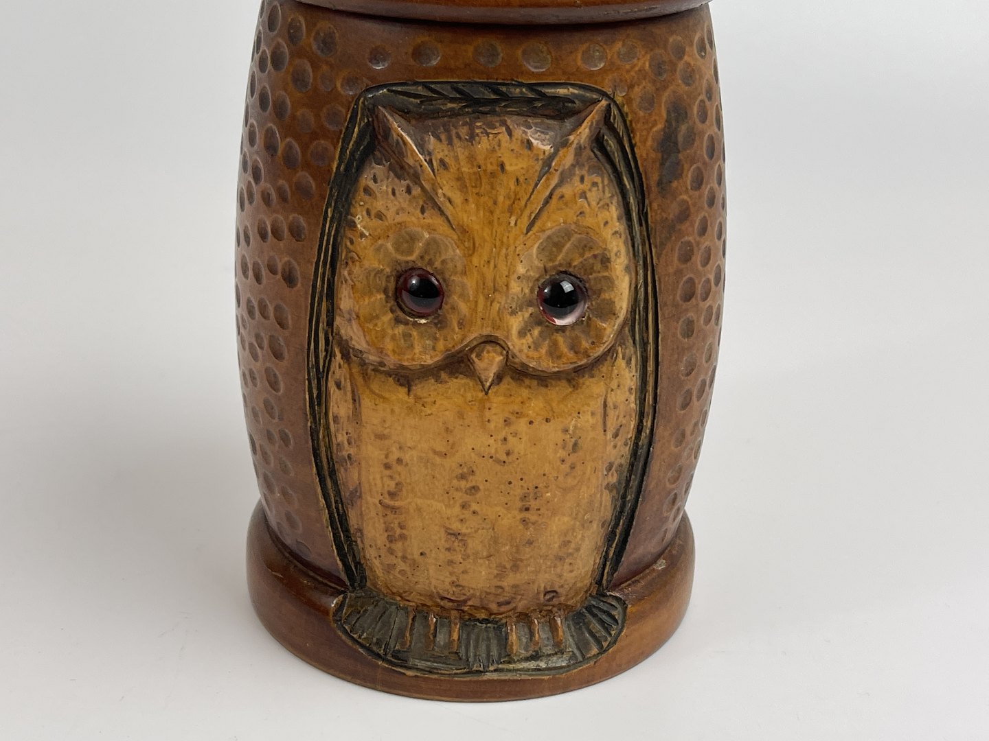 Handmade tobacco jar / lid jar in wood with carved owl in relief. A smaller owl head is carved and attached as a handle to the lid. Both owls have glass eyes. 1 half of the 20th century.