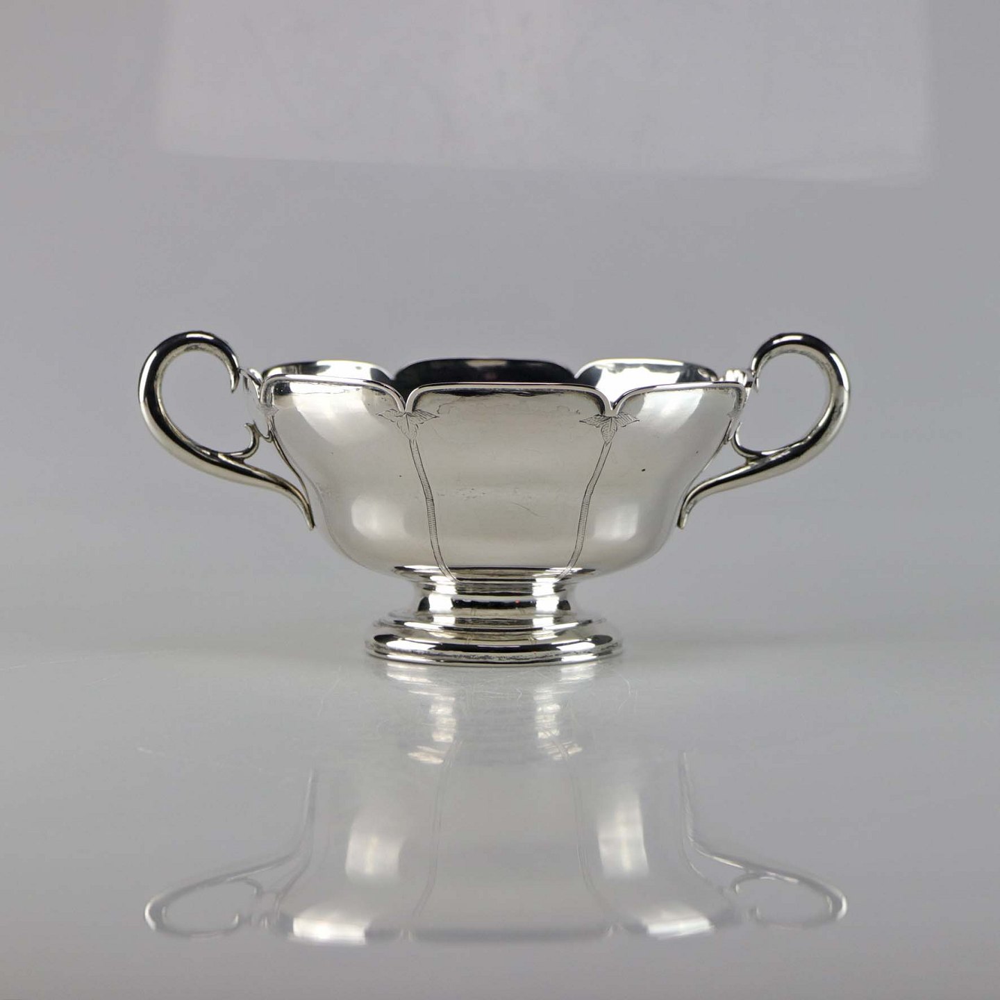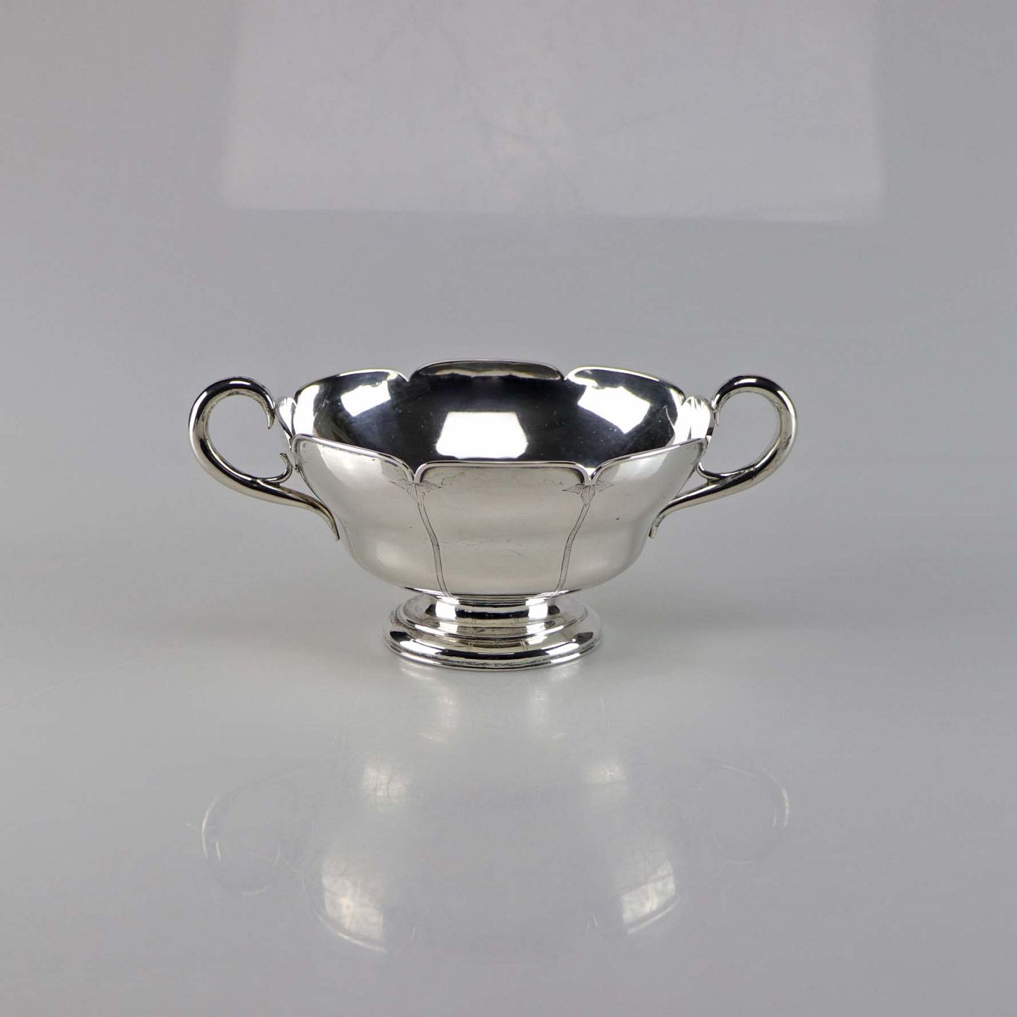Sukker skål på fod i tretårnet sølv dekoreret med bølget kant og 2 hanke