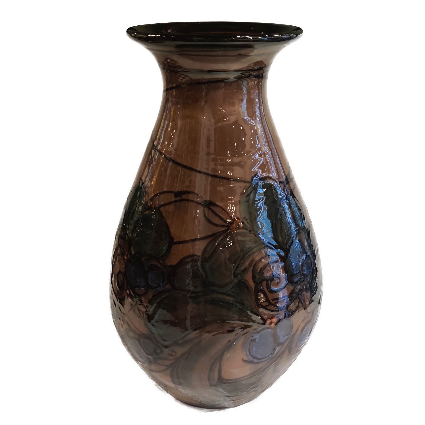 Dekoreret med brun glasur, prydet med koral, grønne og blå farver.
