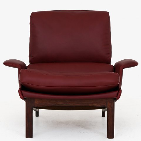 Reupholstered lounge chair and foot stool in 'Elegance' aniline leather (colour: Indian Red) on a rosewood frame. Designed in 1958.