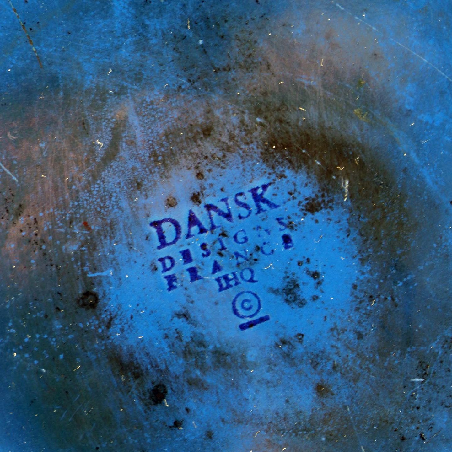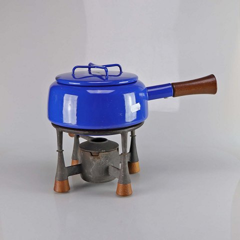 Text available in Danish: Kobestyle fonduegryde i metal med blå emalje og brænder i støbejern