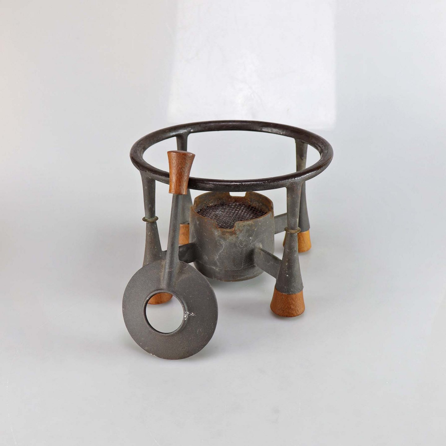 Fonduesættet med gryde model France i emaljebelagt jern er med håndtag i teaktræ. Brænder med låg har håndtag og fødder i teaktræ