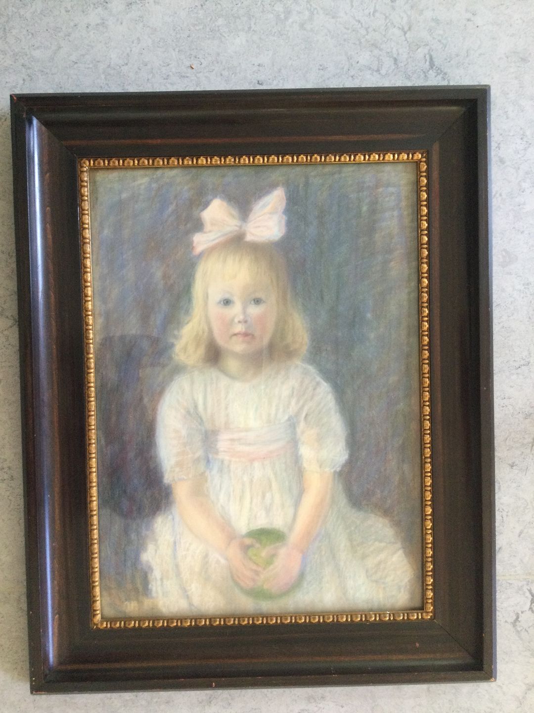 Siddende pige med sløjfe i håret og grøn bold 1916.
