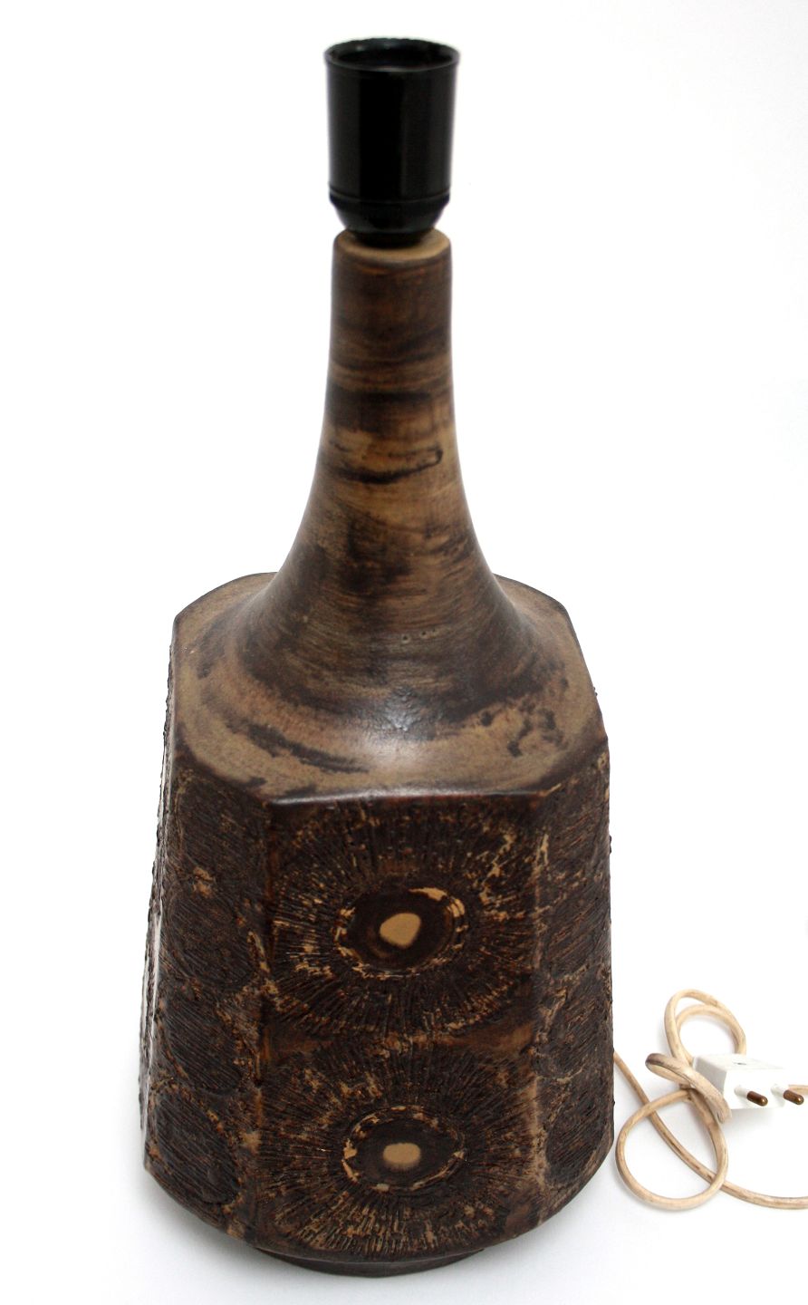 Bjørn Keramik, Bordlampe i brun glasur med blomst motiver. Højde excl. fatning 42 cm. Diameter bund 19,5 cm. Glasurafslag i bund se ekstra foto. Pris: 550 kr.