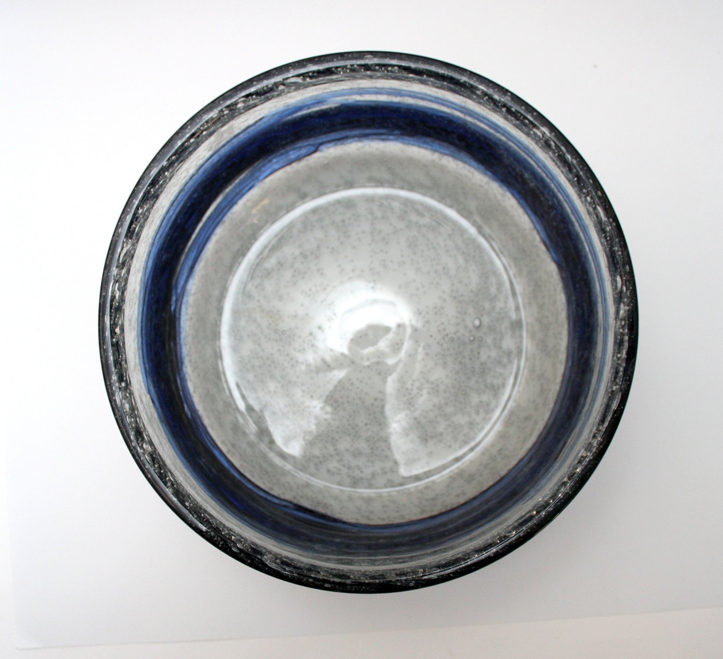 Hadeland, Norway, Stor skål i glas med bobler og blåt bånd. Designet af Willy Johansson. Signeret Hadeland WJ. Højde 11,5 cm. Diameter 22 cm. Vægt 2,6 kg. Fin stand. Pris: 575 kr.