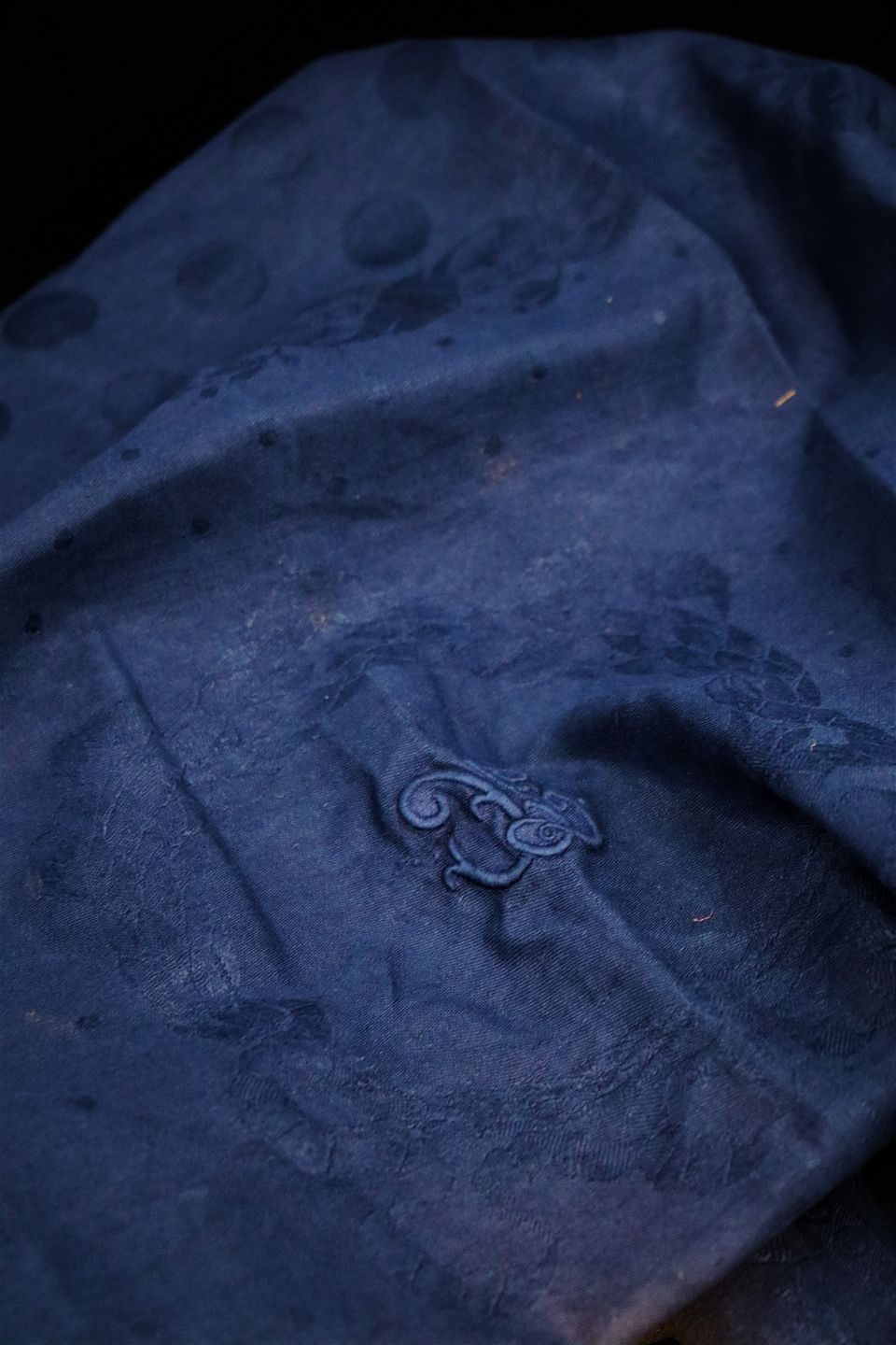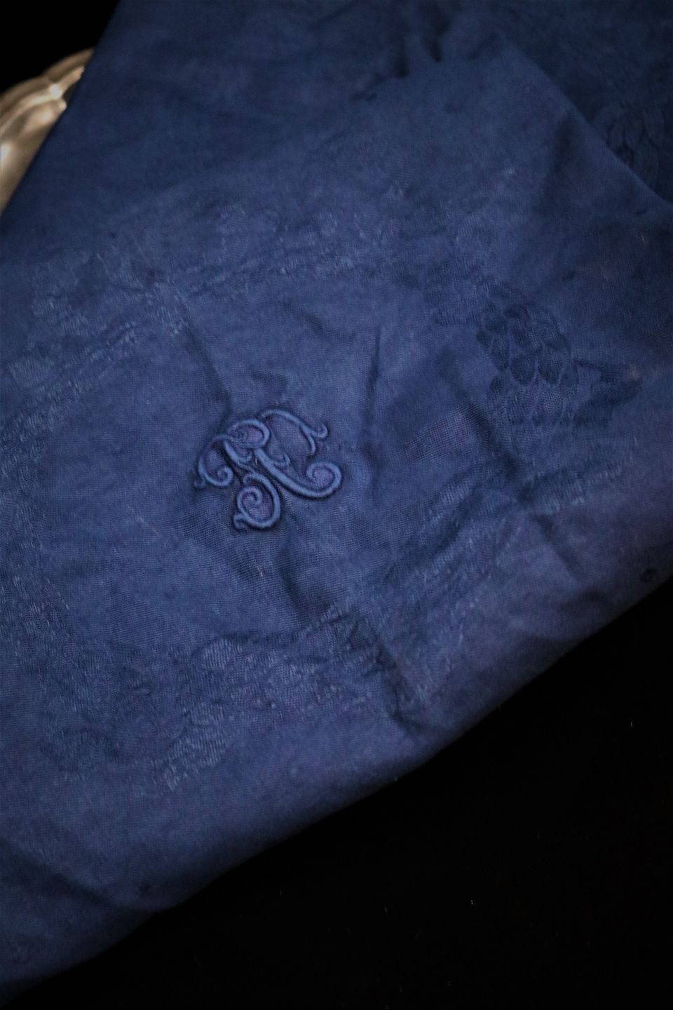 med monogram og blomster motiver i fin mørkeblå farve.