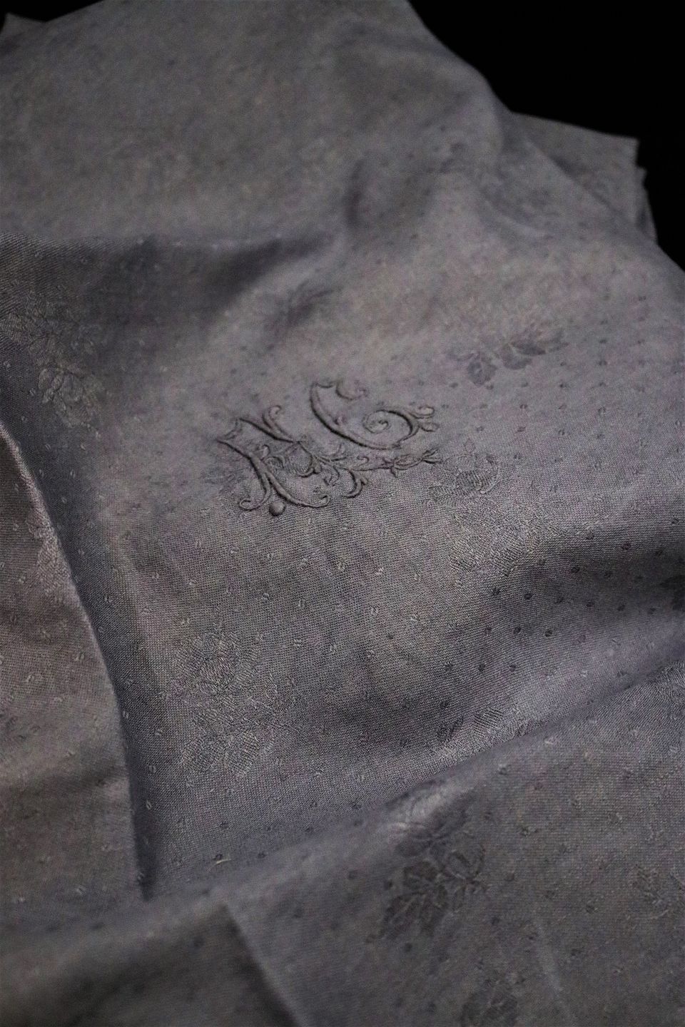 12 pcs. beautiful old French damask woven linen napkins with monogram and floral motifs in a nice gray colour.