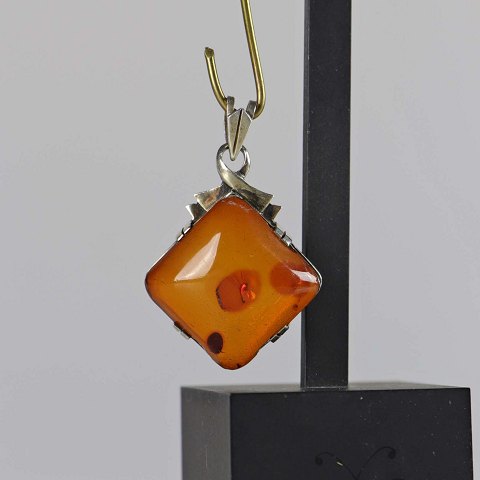Kvadratisk vedhæng i sølv med ravstykke i midten.