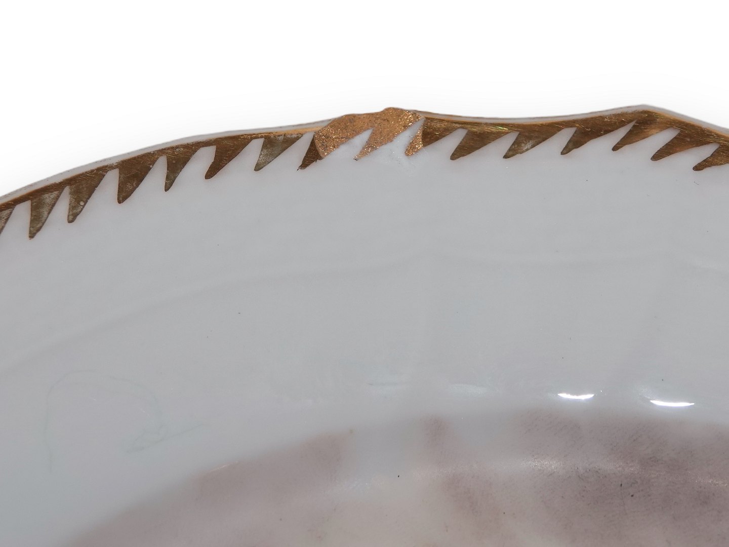 There are two chips on the edge (see pictures) and there is a very little wear on the gold edges otherwise perfect condition with no chips, cracks or repairs.