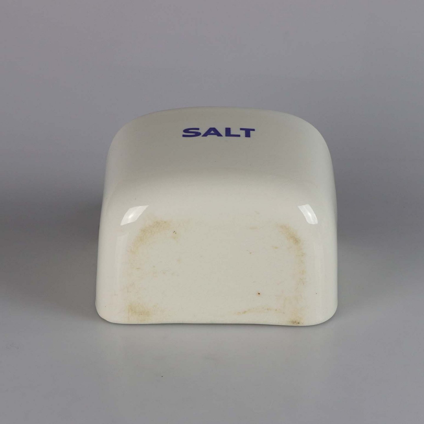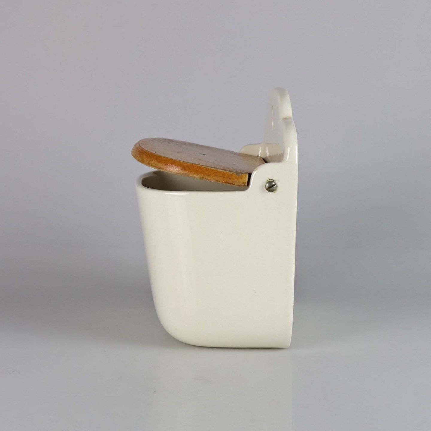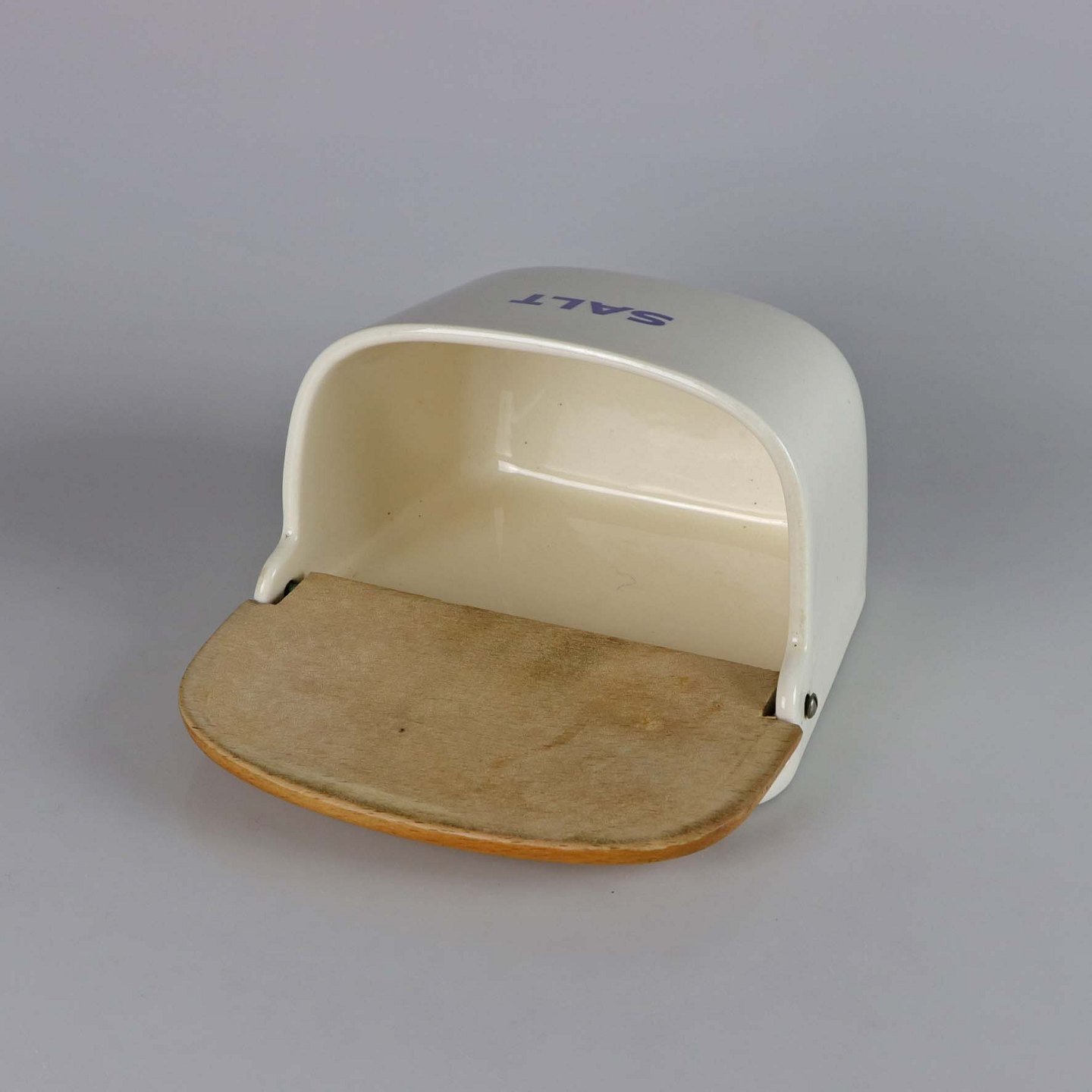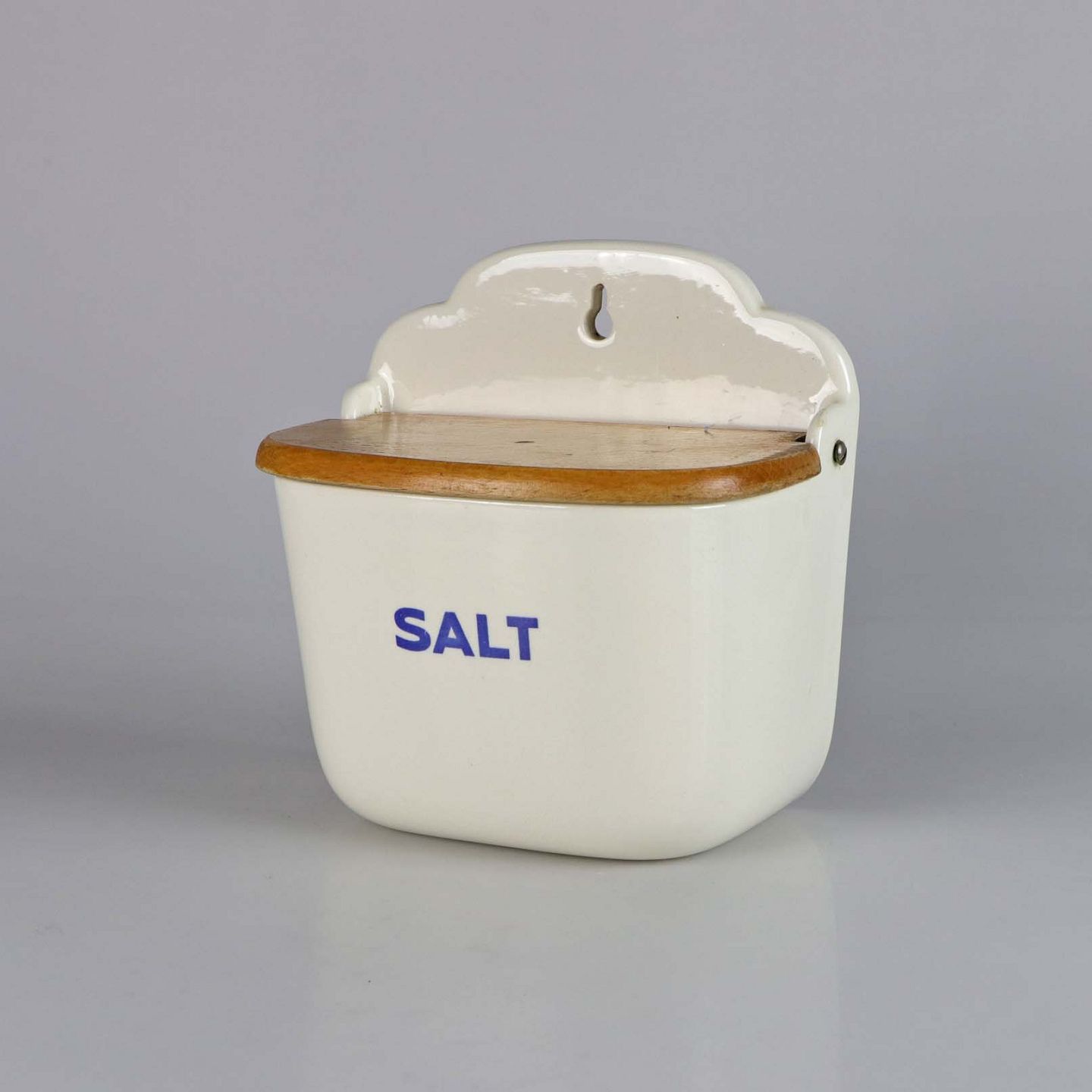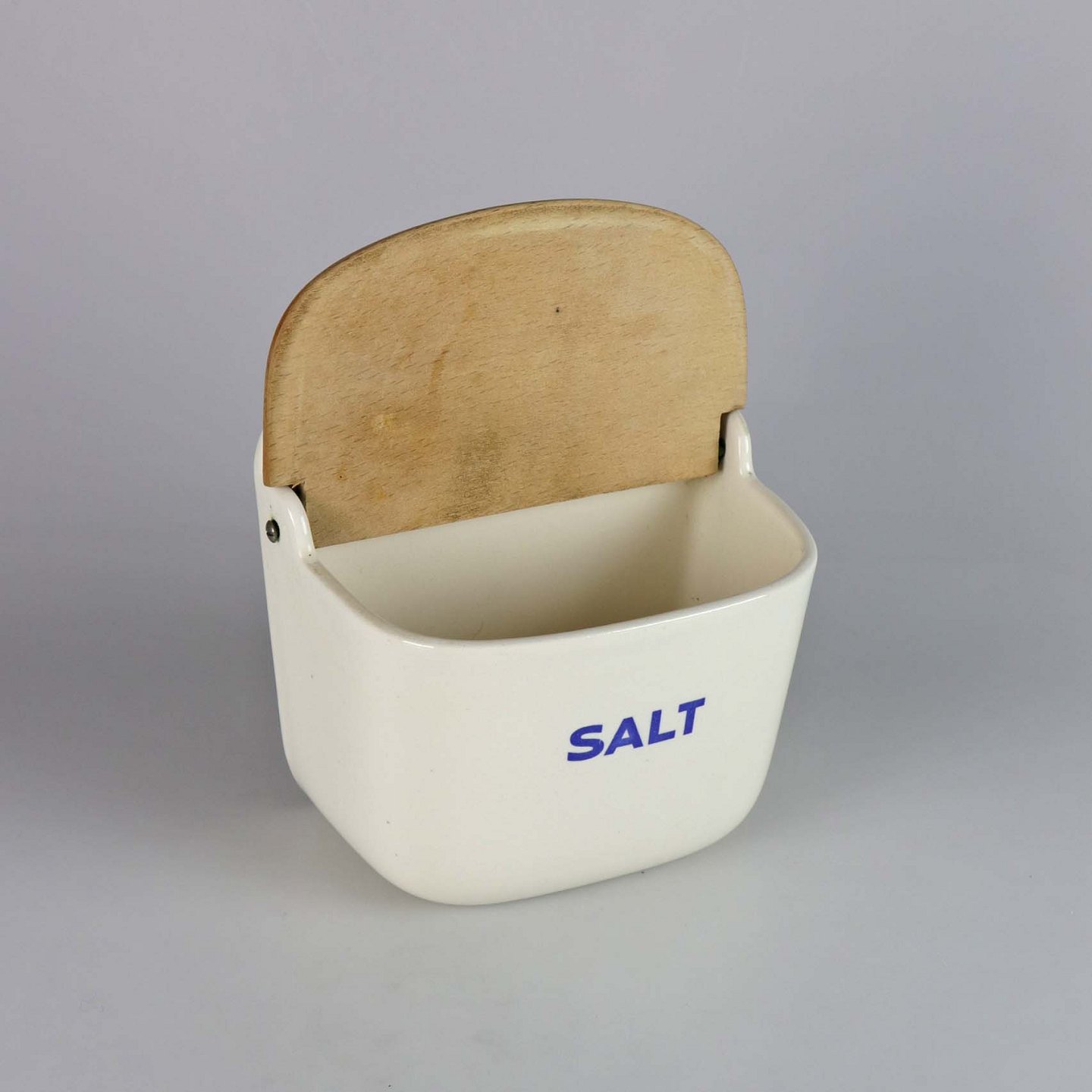 Saltkar til ophæng i fajance med teksten SALT. Låger er i lakeret træ