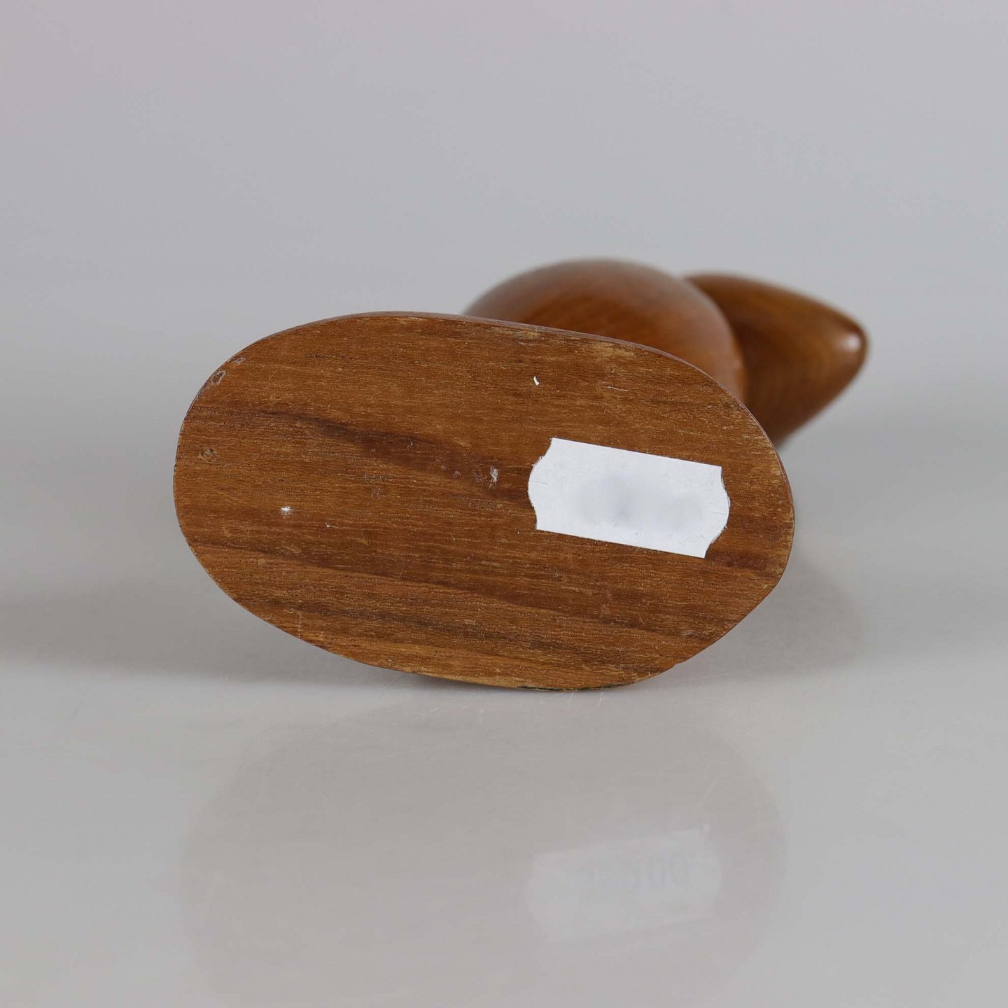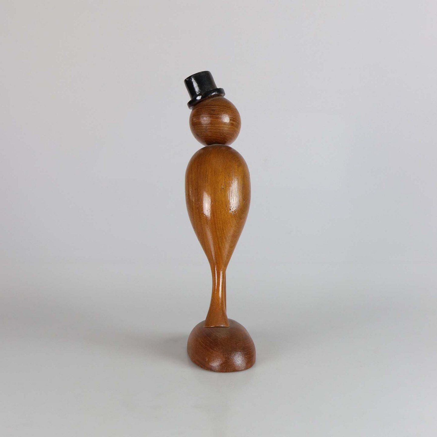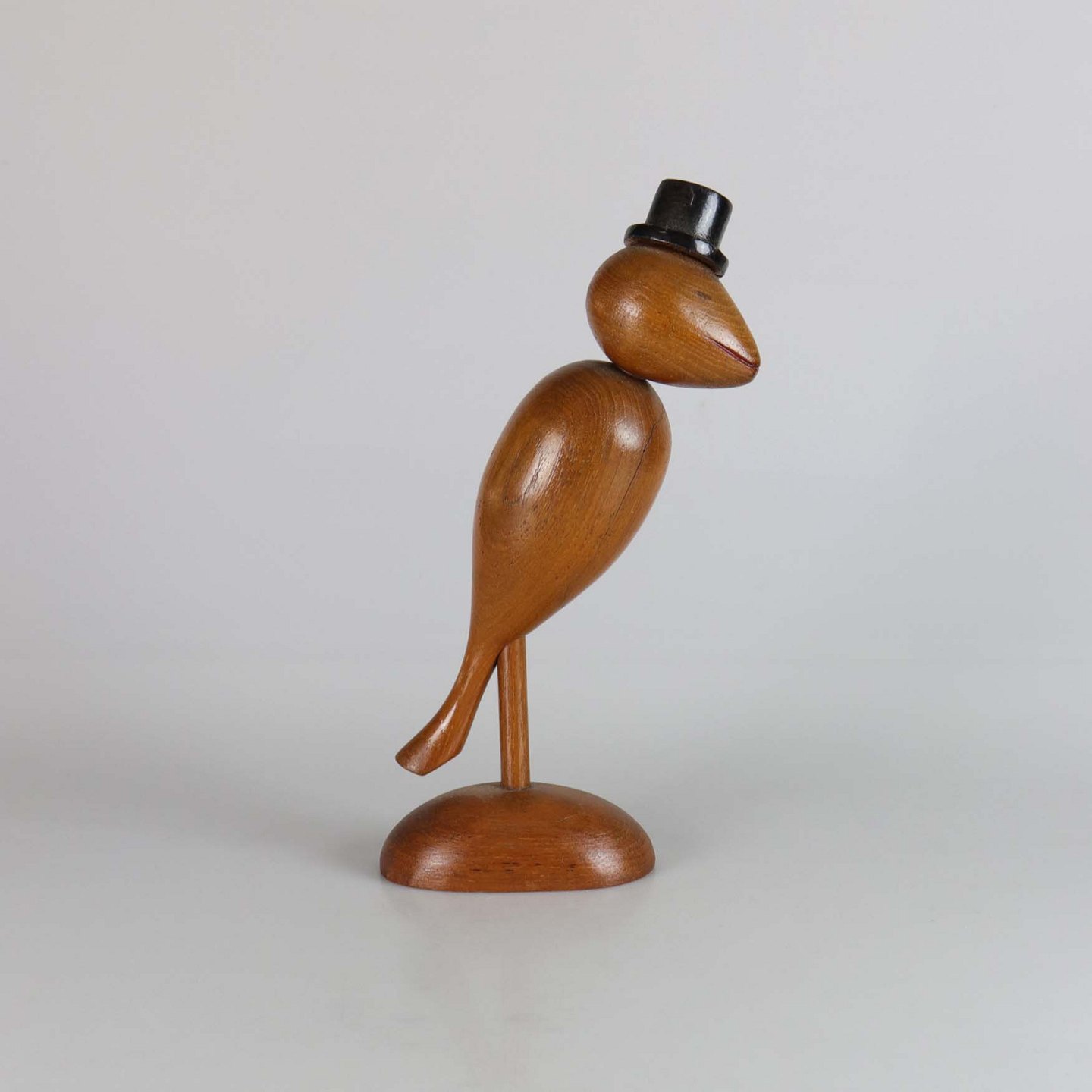 Figur i lakeret teaktræ med motiv af stående fugl med sort hat
