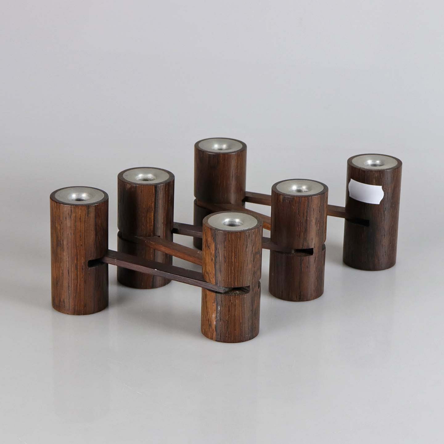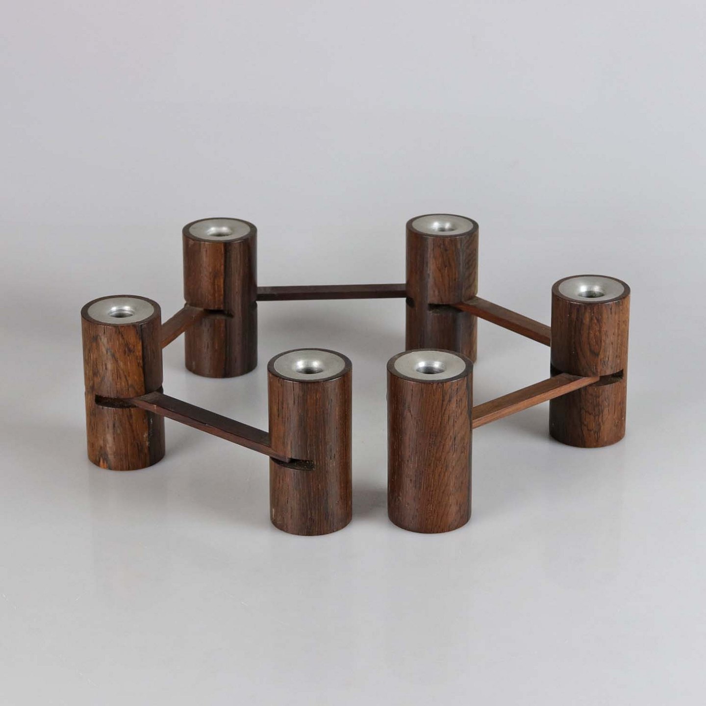 Lysestage i teaktræ med seks bevægelige lysholdere.