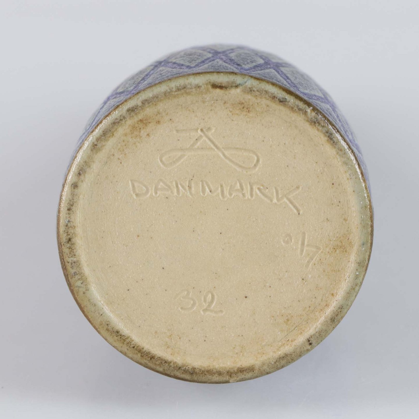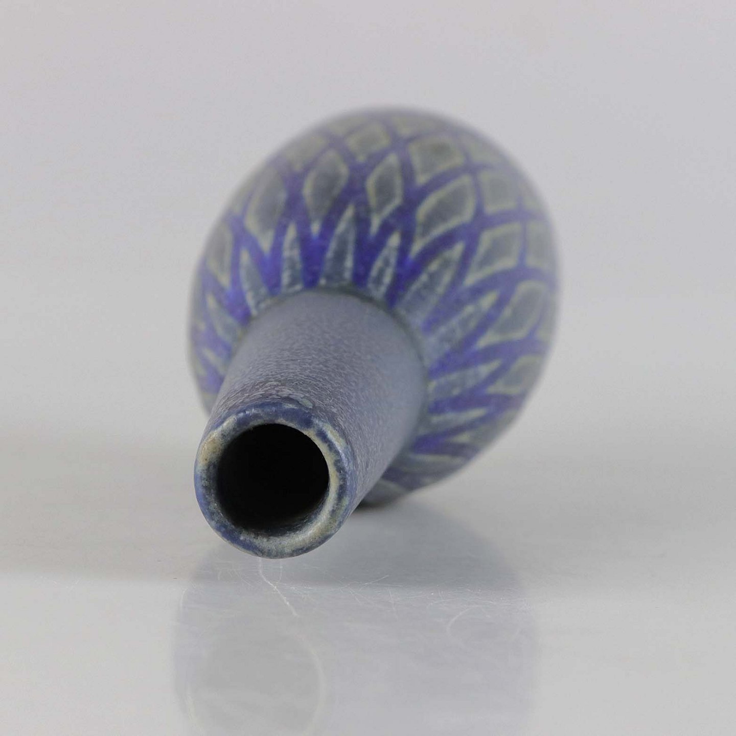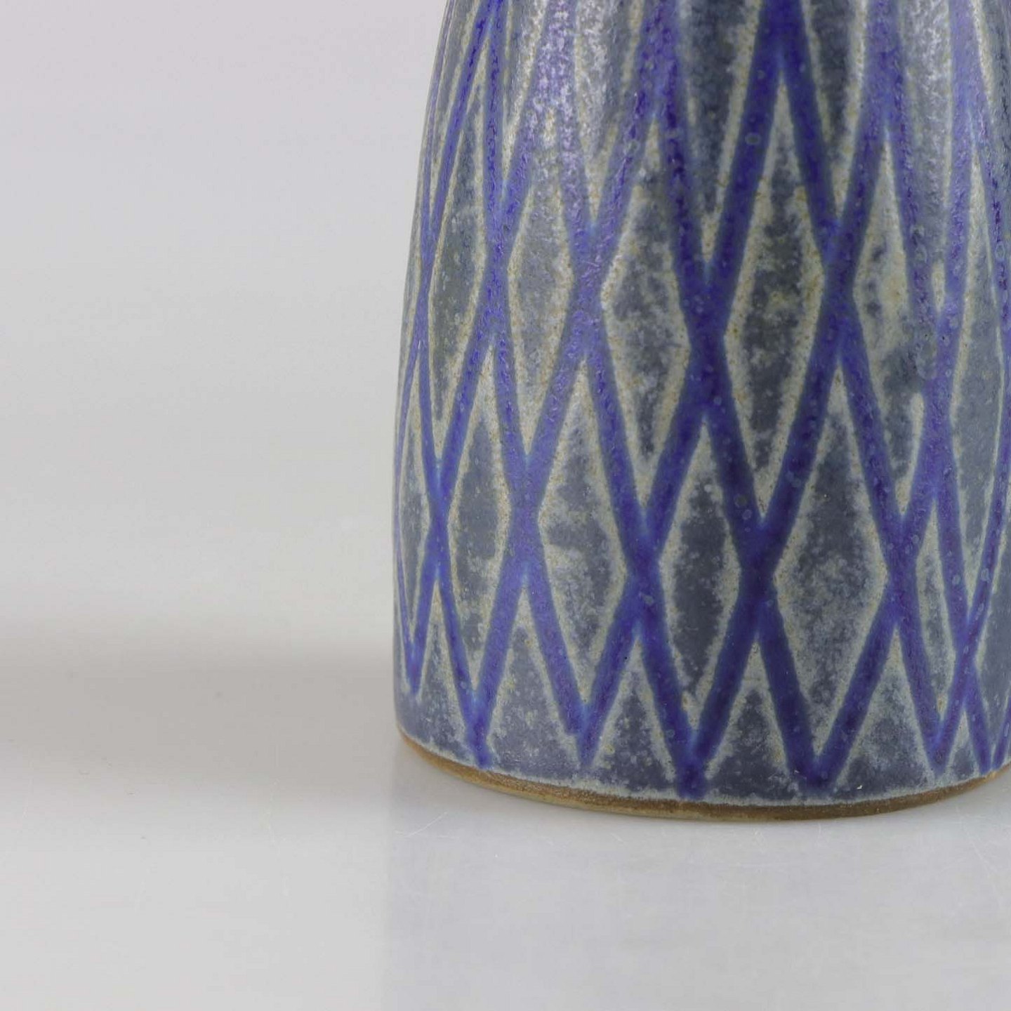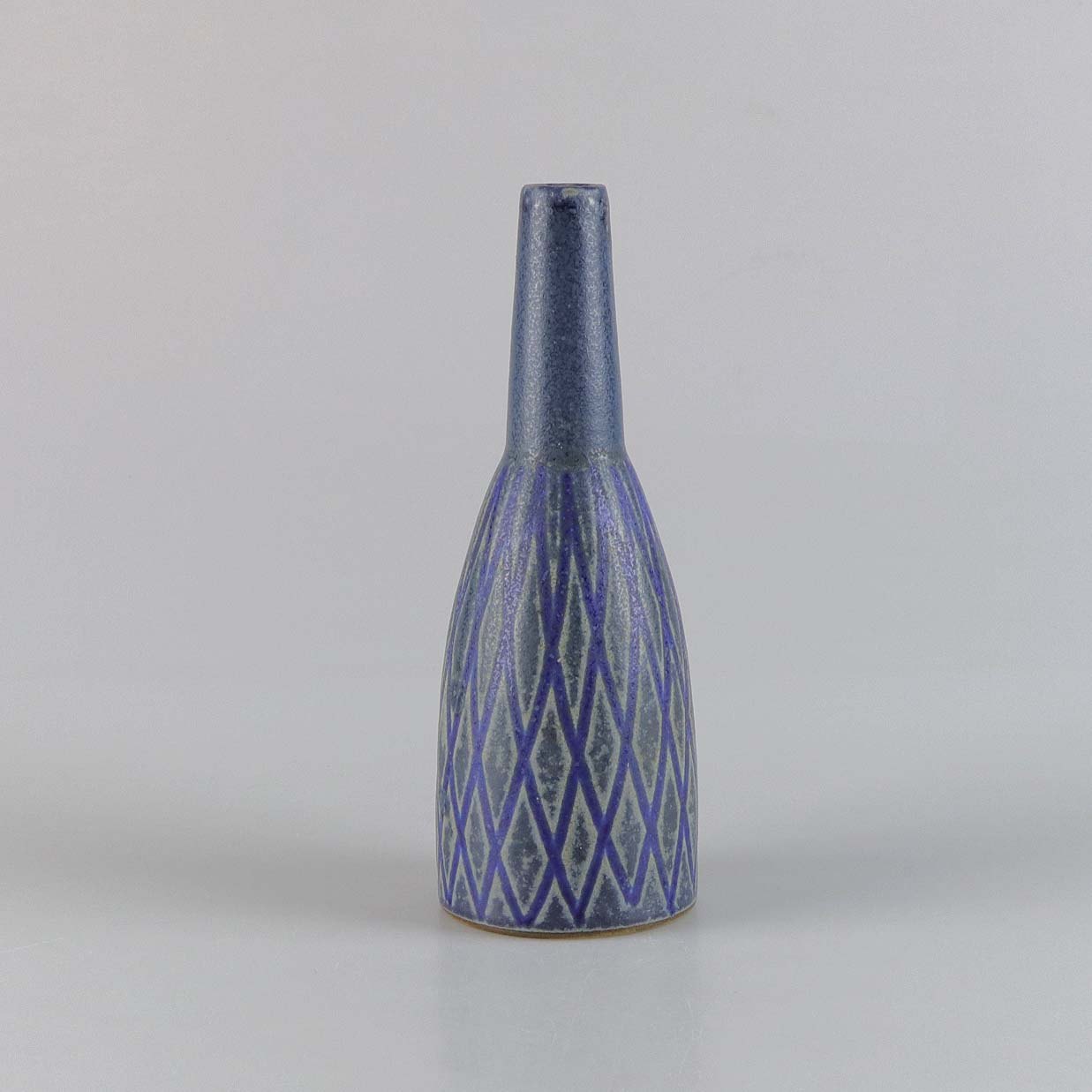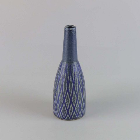 Blå vase i stentøj med slank hals og gråt harlekin mønster.