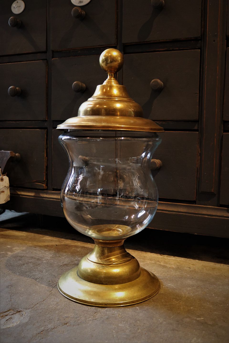 LARGE, old French candy jar "pot á bonbon" in glass with brass lid and base. H:59cm. Dia:26cm.