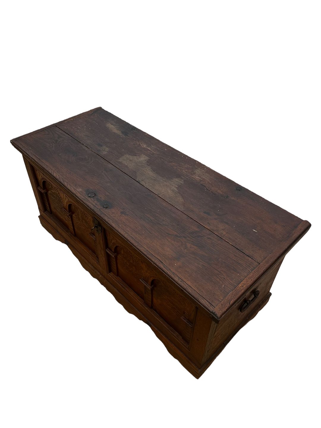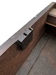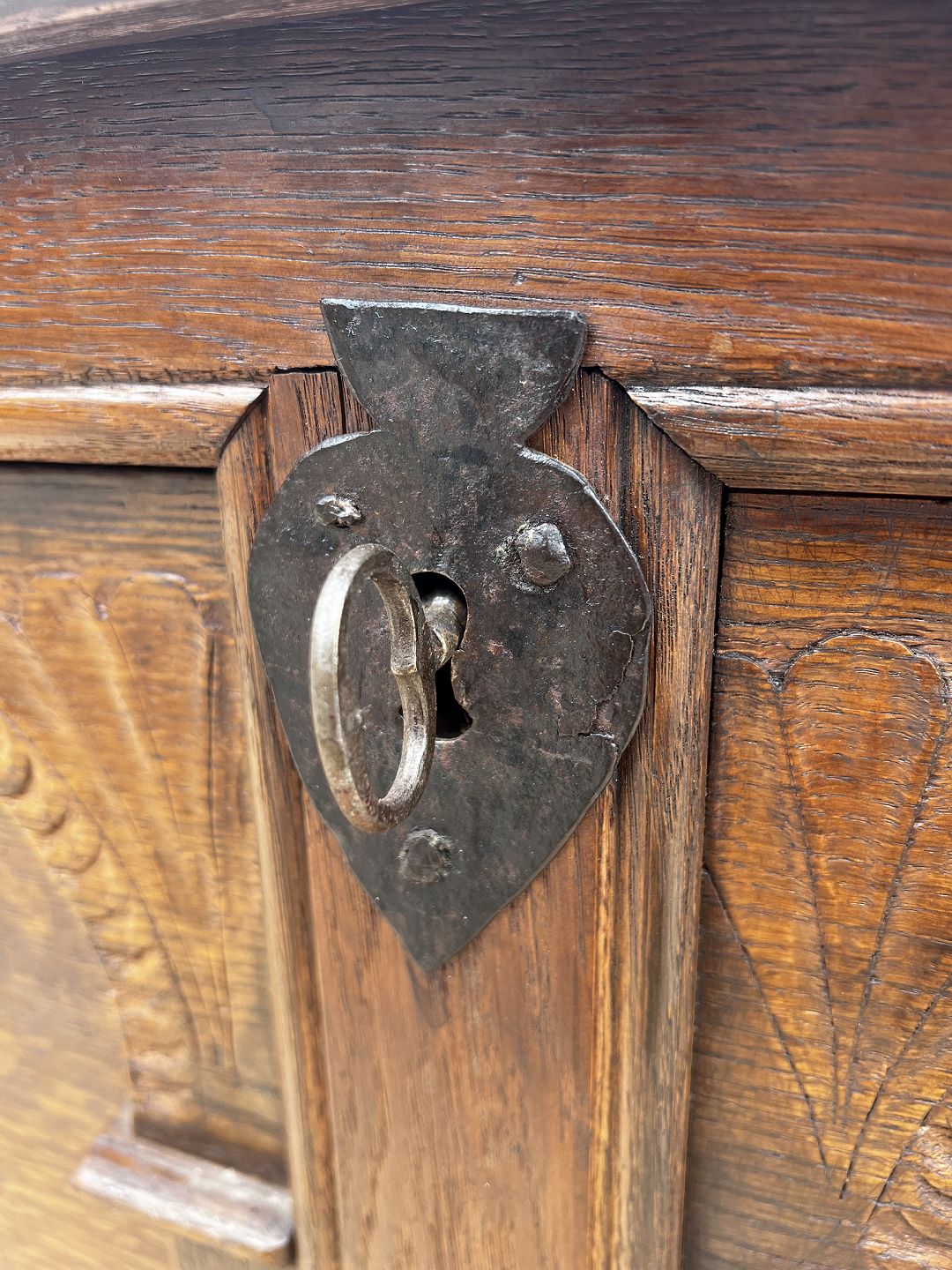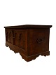Kiste i egetræ med et fladt låg, samt 3 buede fronter og udskæringer fra år 1760'erne.