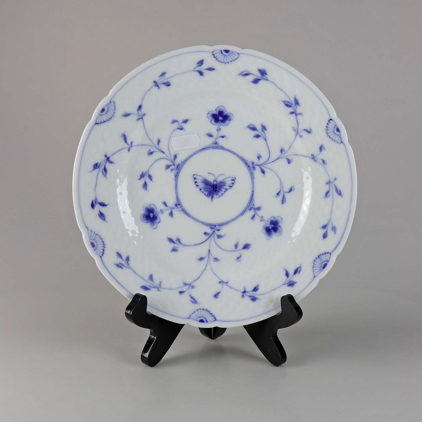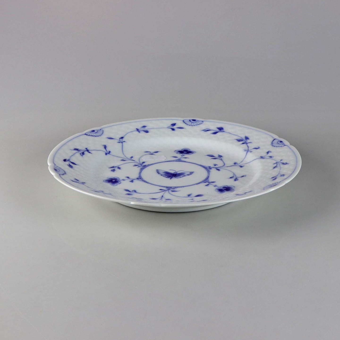 Tallerken i hvidt skælformet porcelæn med blå motiver af blomster og sommerfugle.
