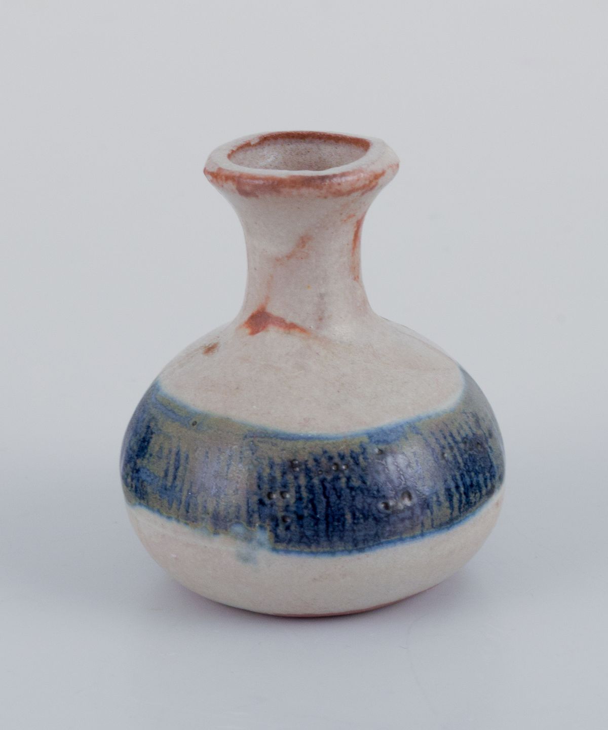 Stouby Keramik, Denmark, a collection of nine miniature ceramic vases with glaze in brown and sandy tones.
