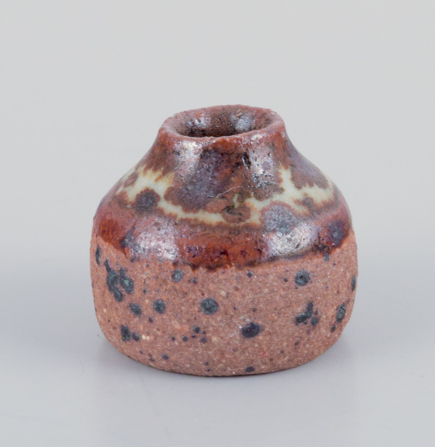 Stouby Keramik, Denmark, a collection of nine miniature ceramic vases with glaze in brown and sandy tones. Handmade.
