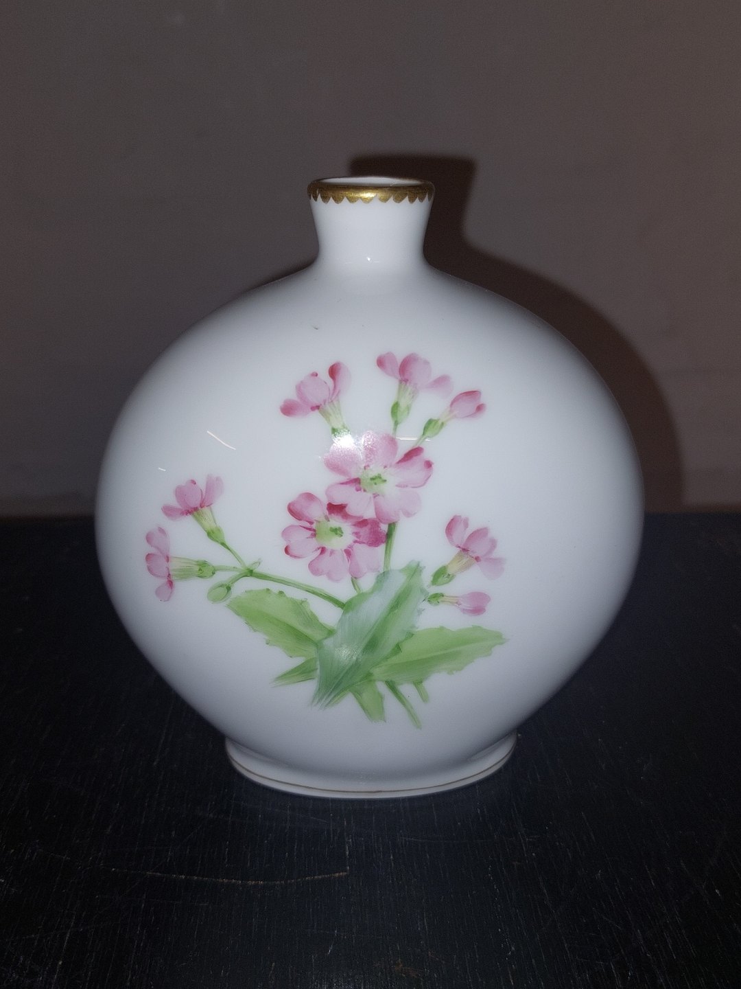 Art Nouveau period: Pill-shaped vase In porcelain from Royal Copenhagen with painted flowers on both sides in overglaze. Made in the late 19th century between 1894-1900. In perfect condition. No damage or repairs. 1. Sorting. H. 14.5 cm.