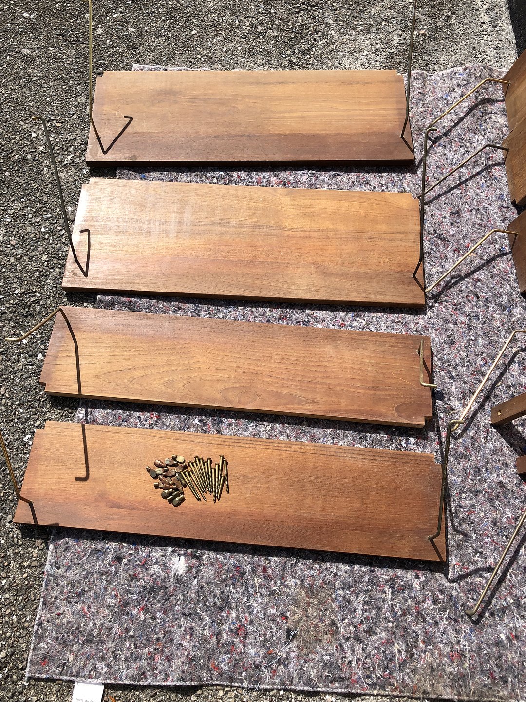 Shelf system in teak veneer. Danish modern from the 1960s. 9 shelves: 5: 80x20cm and 4: 80x30cm, 4 strips: 2: 200cm, 1: 140cm and 1: 100cm. With traces of use / rust on the brackets.